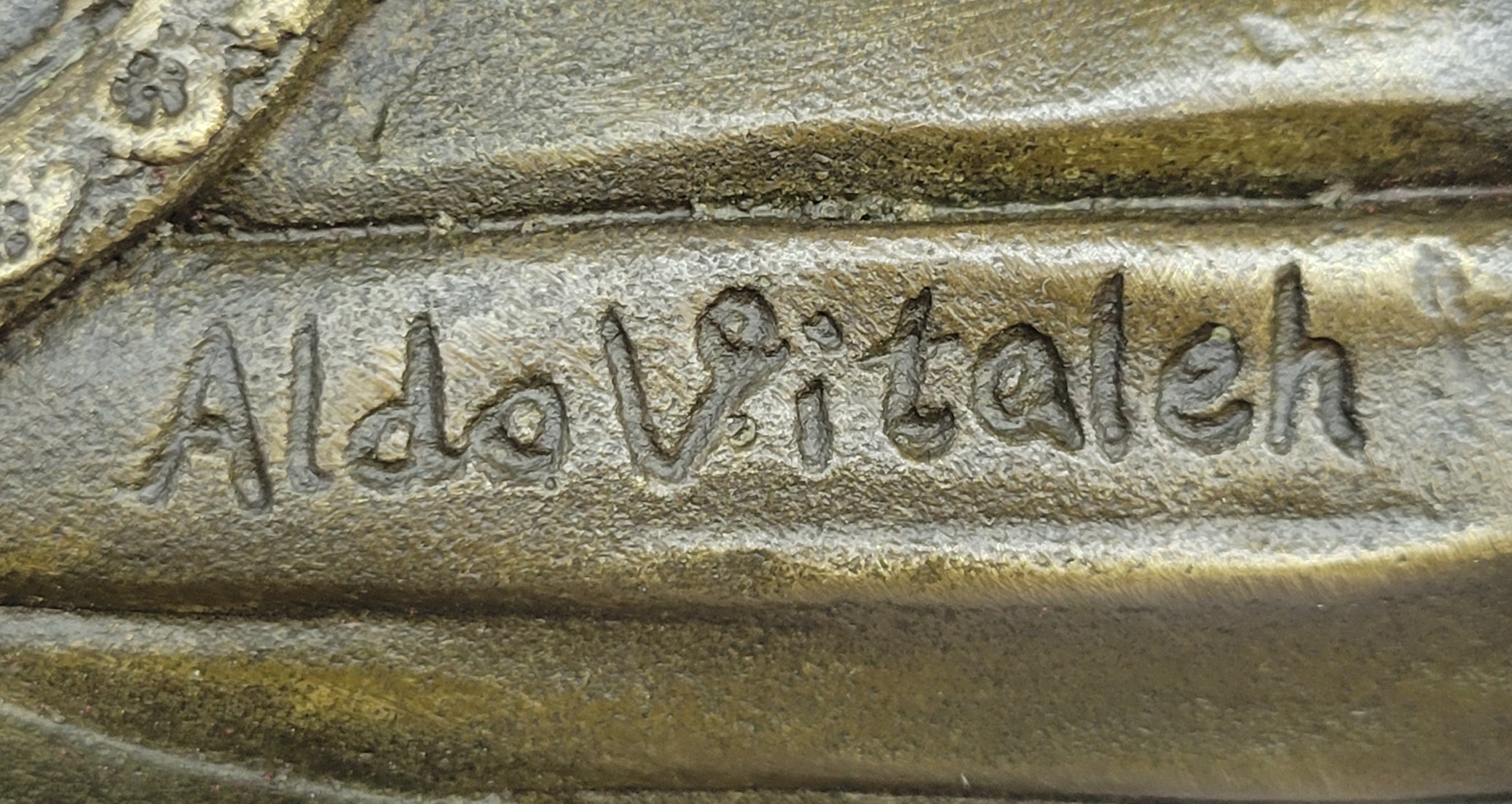 Resting atop a polished marble base, this stunning bronze sculpture stands as a timeless tribute to the elegance and allure of the 1920s. Handcrafted with meticulous attention to detail, the sculpture reflects the artist's dedication to preserving the spirit of the silent era, with each element meticulously sculpted to evoke a sense of nostalgia and appreciation for the enduring beauty of the early 20th century. Signed by the renowned artist Aldo Vitaleh, the sculpture is a testament to the artist's enduring legacy and contribution to the art world.Bronze Dimensions with Marble Base: Height 13.5" X Width 5.5"