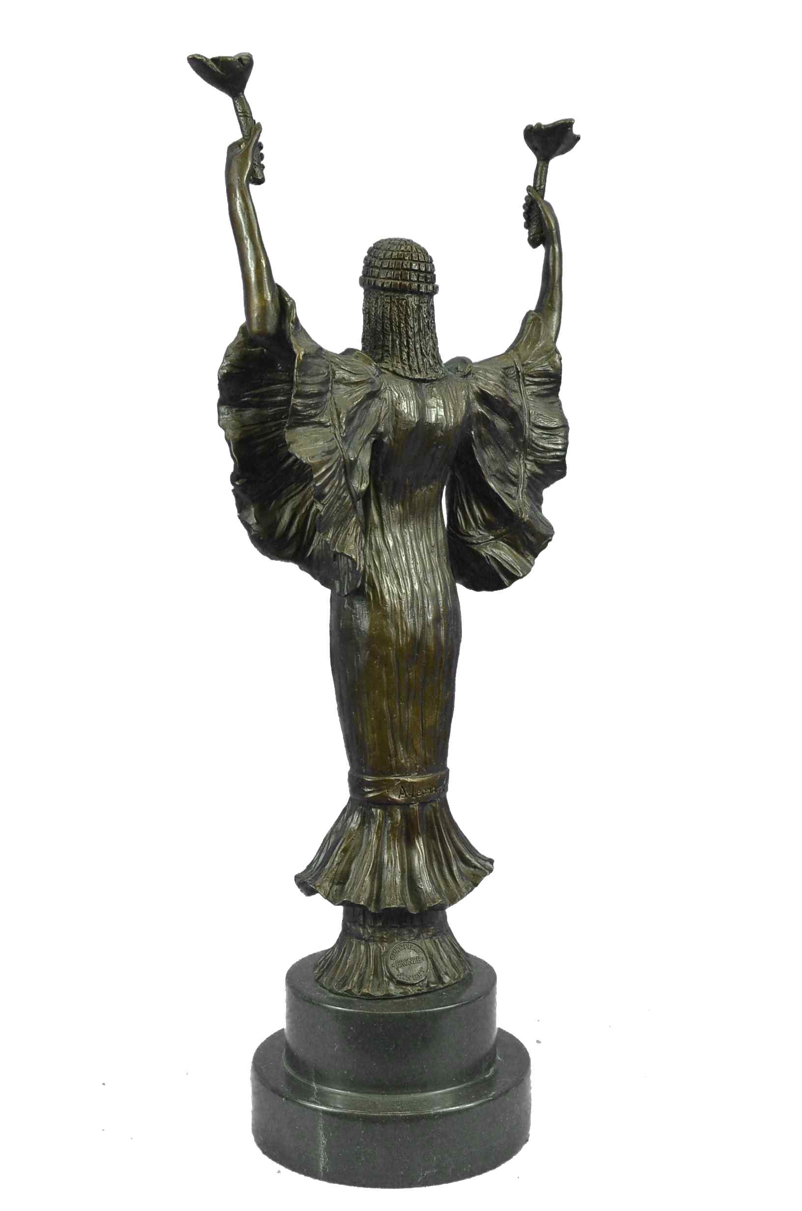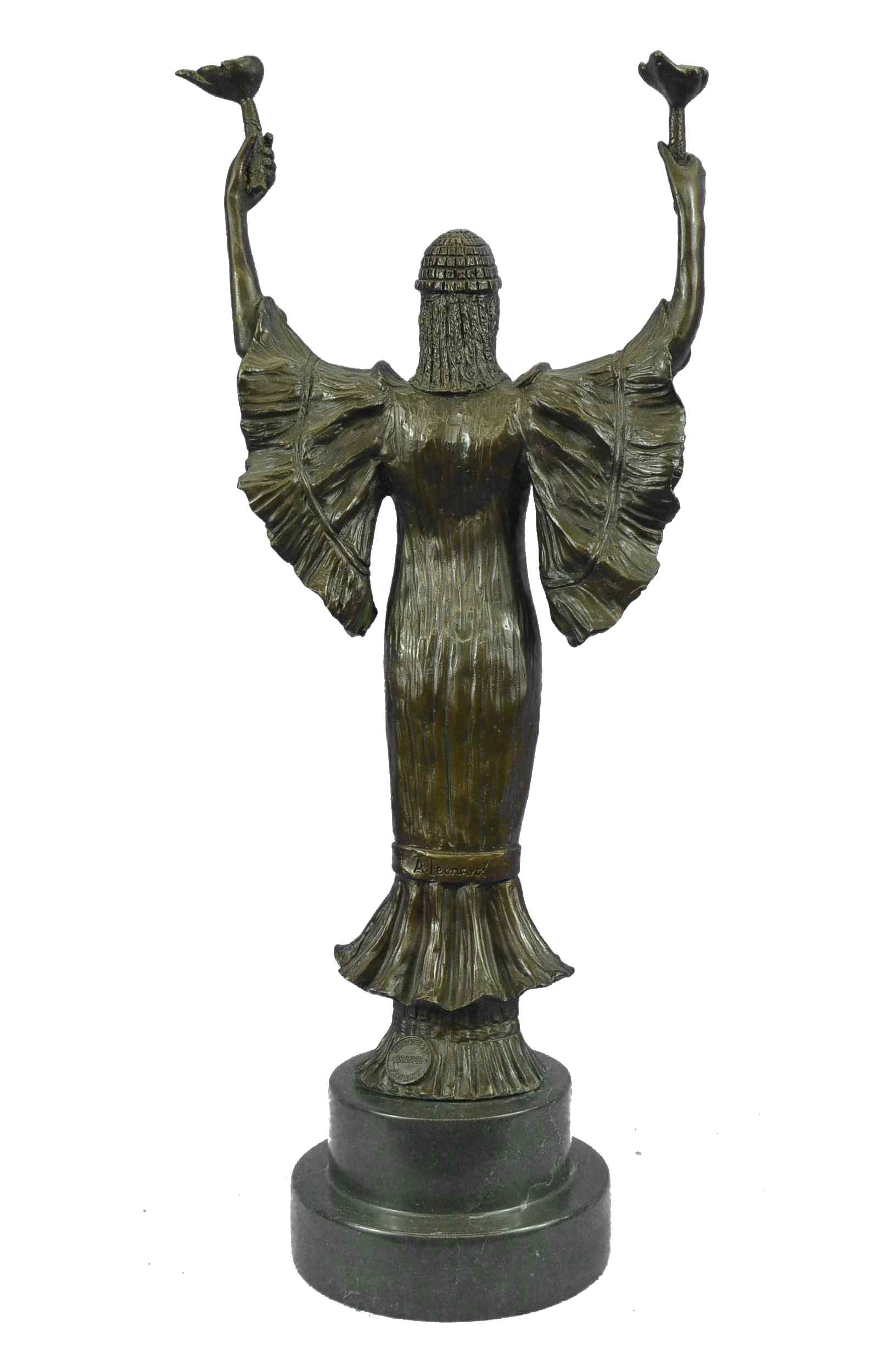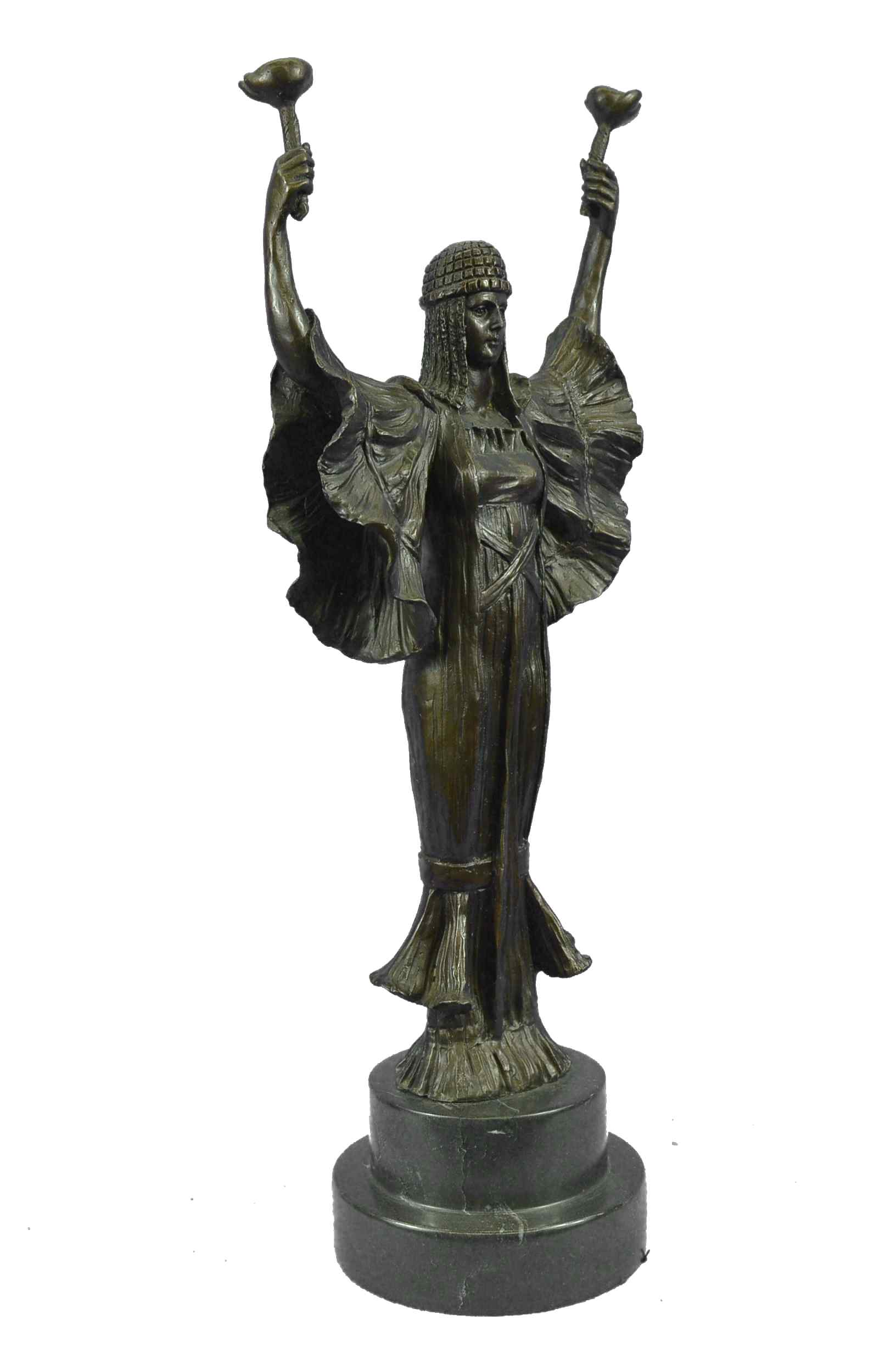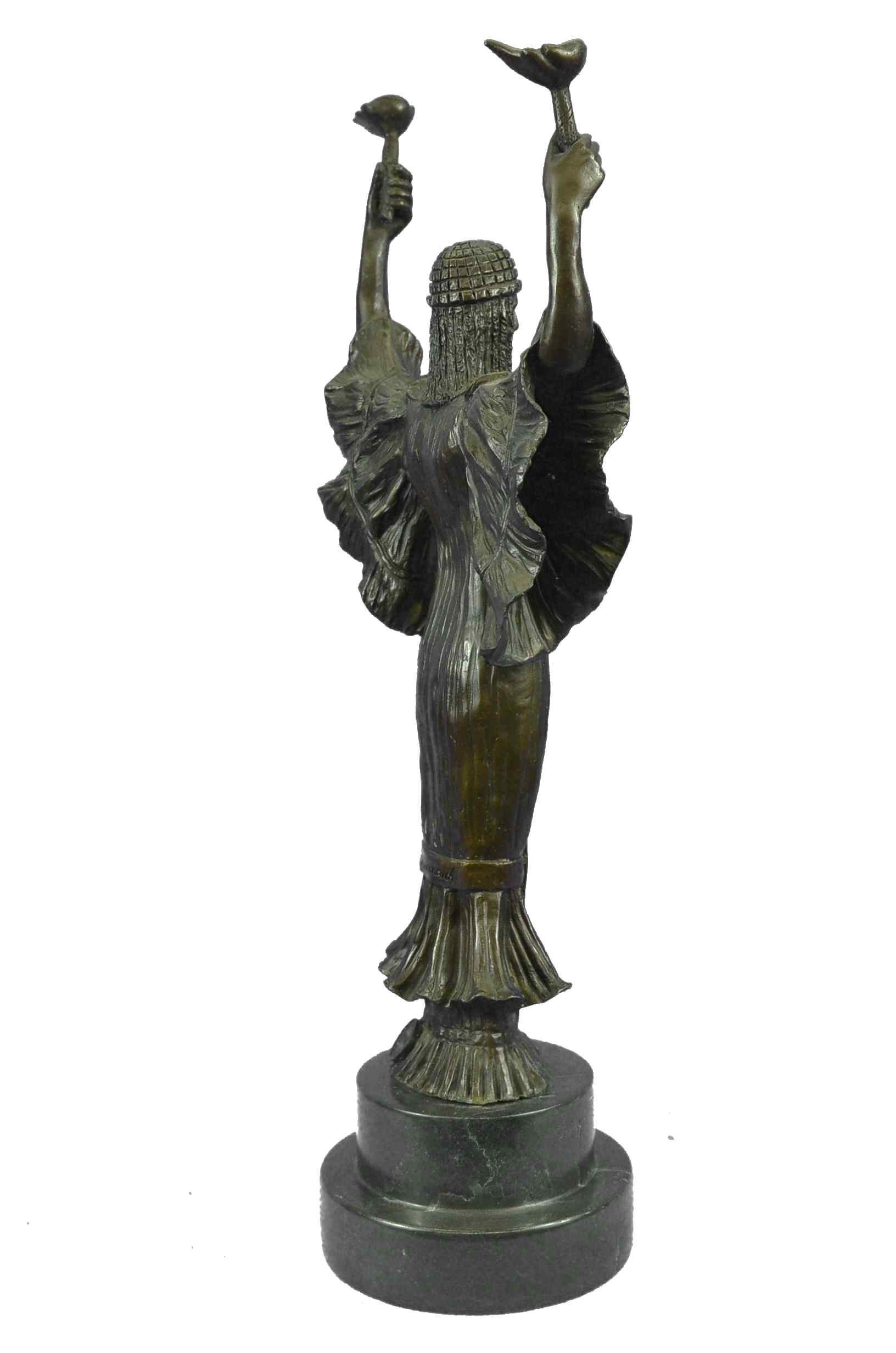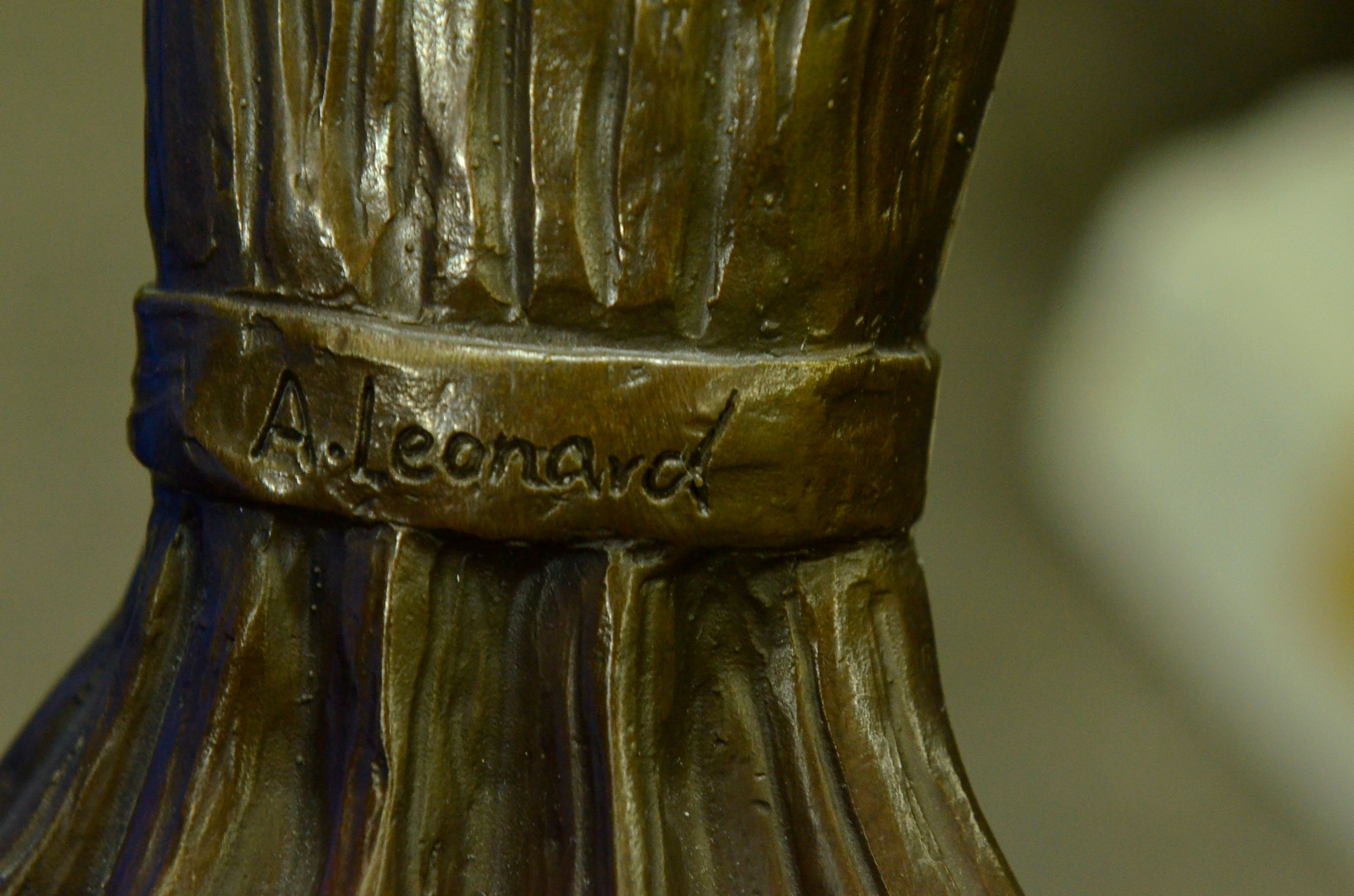 This beautiful sculpture of a woman standing with both her arms raised up as she holds to object on each is spectacular. She is wearing this long very elegant and Conservative dress that covers hers head to toes. It has these gorgeous ruffles on the wide sleeves that makes it hang low giving her a unique look. The dress has a criss cross right up front of it and it have different layers around the legs, with a very decorative hat to match. This sculpture was casted using the ancient "Lost Wax Method" and its stained in brown patina, 100% handmade and bronze. She is mounted on a triple black marble base, signed by the artist A. Leonard.Bronze Dimensions with Marble Base:Height 20 1/2" x Width 9"