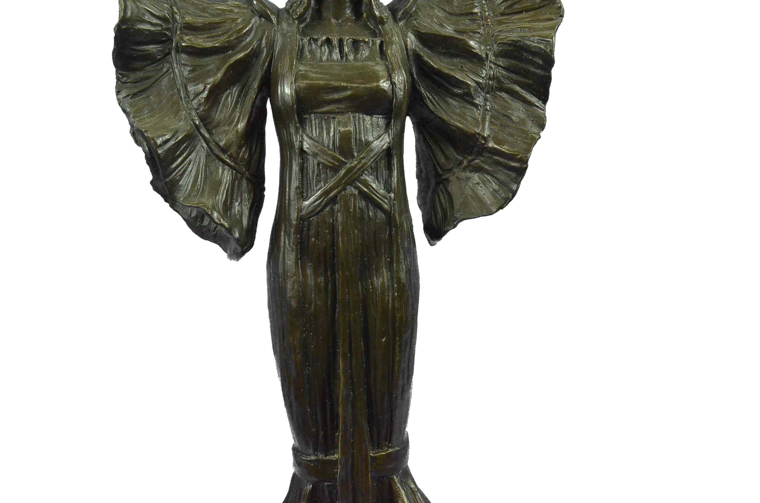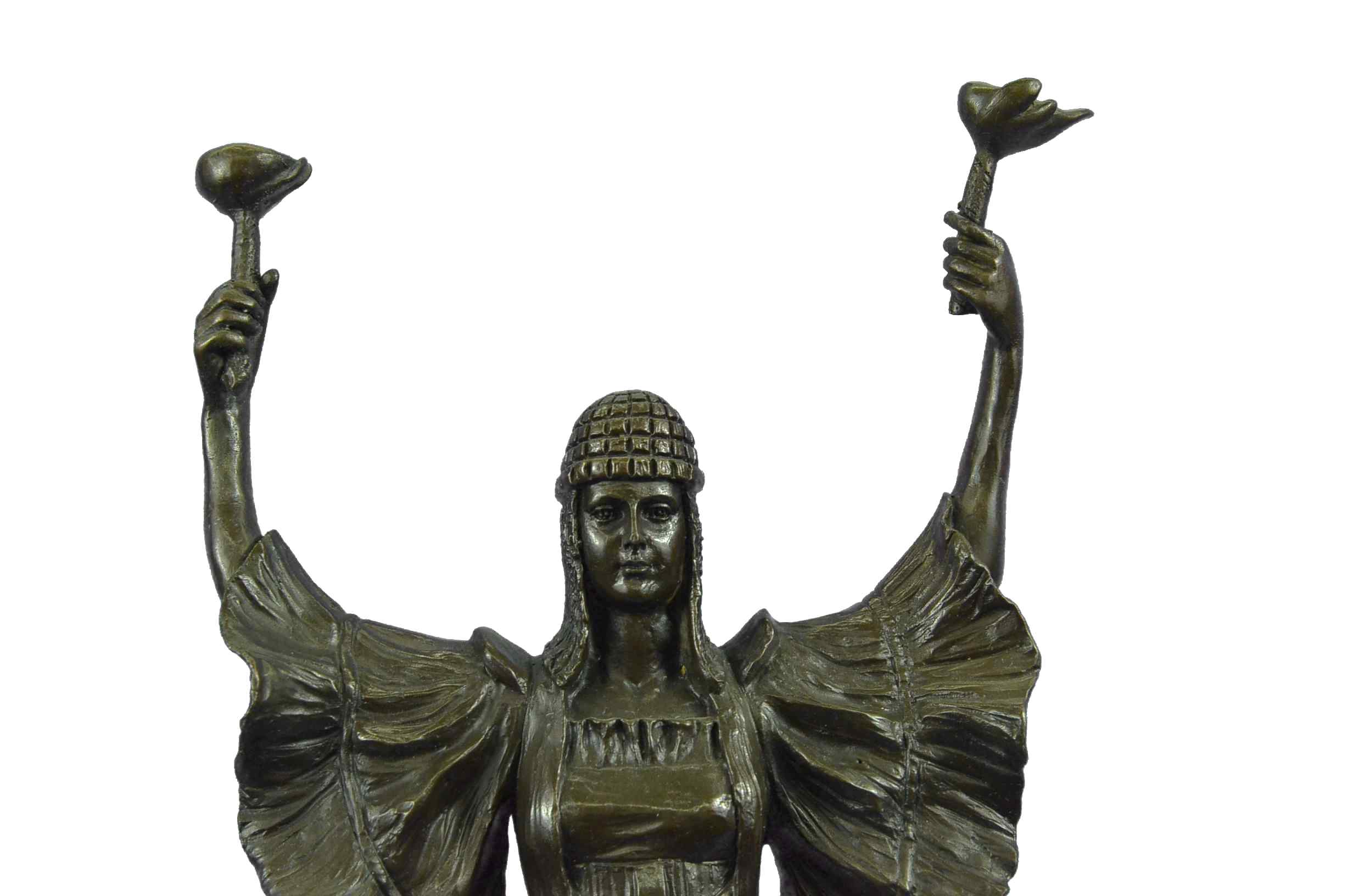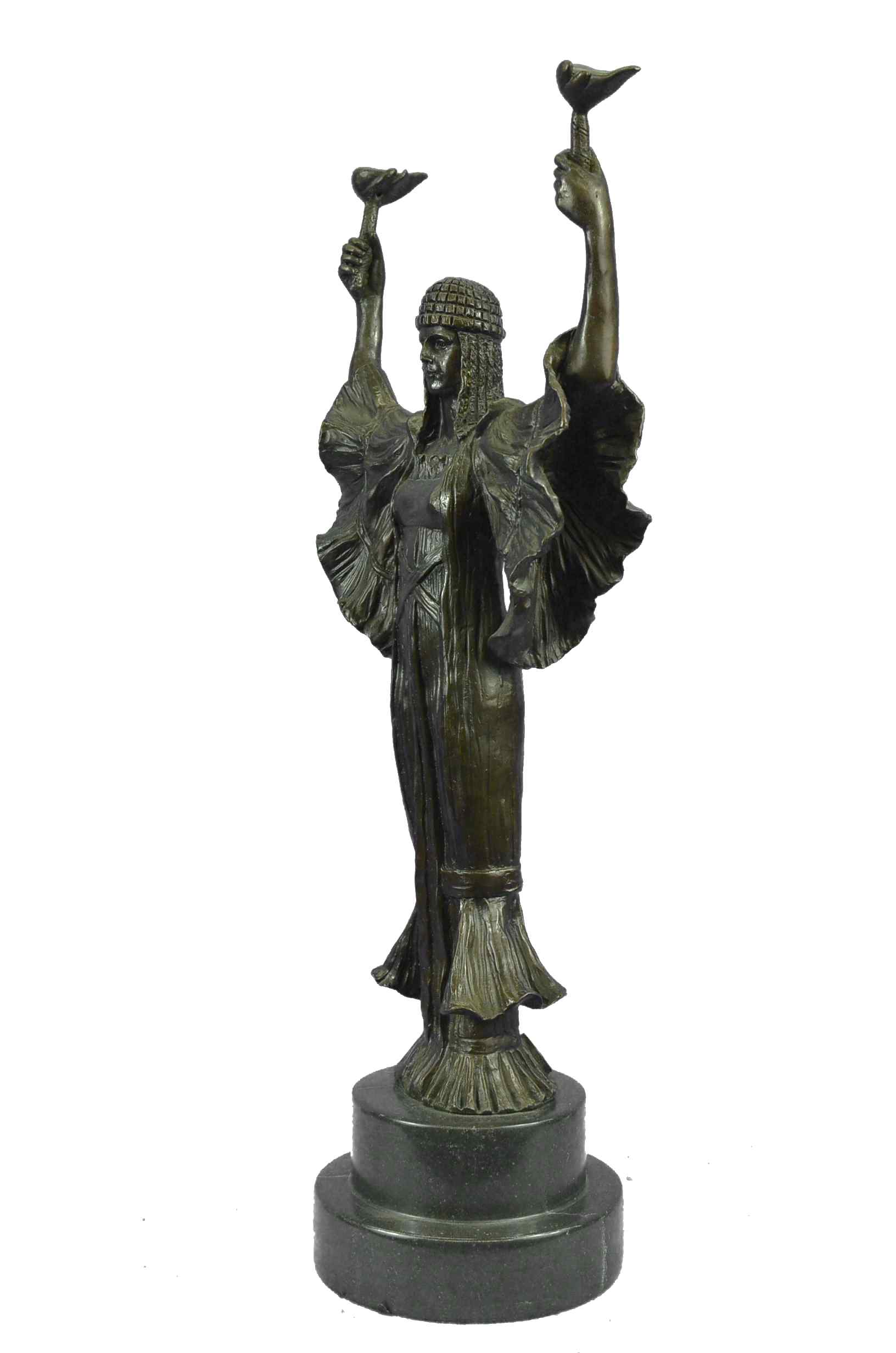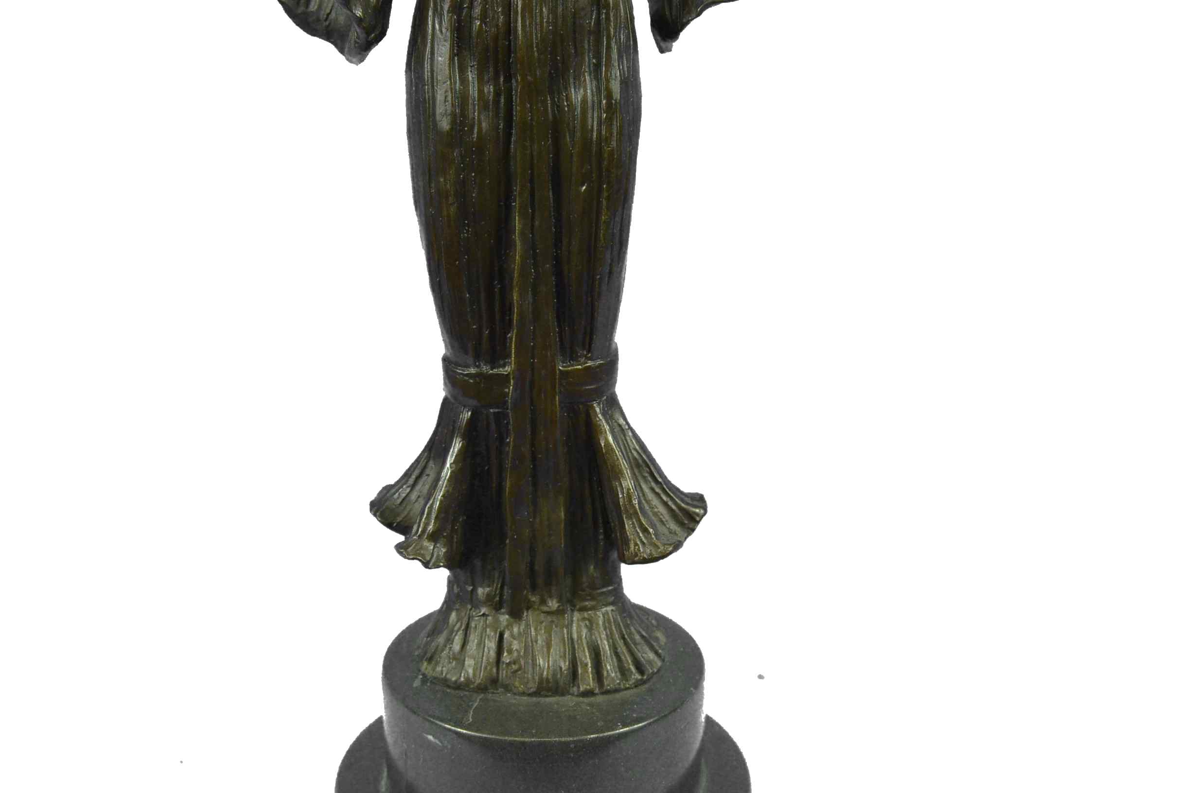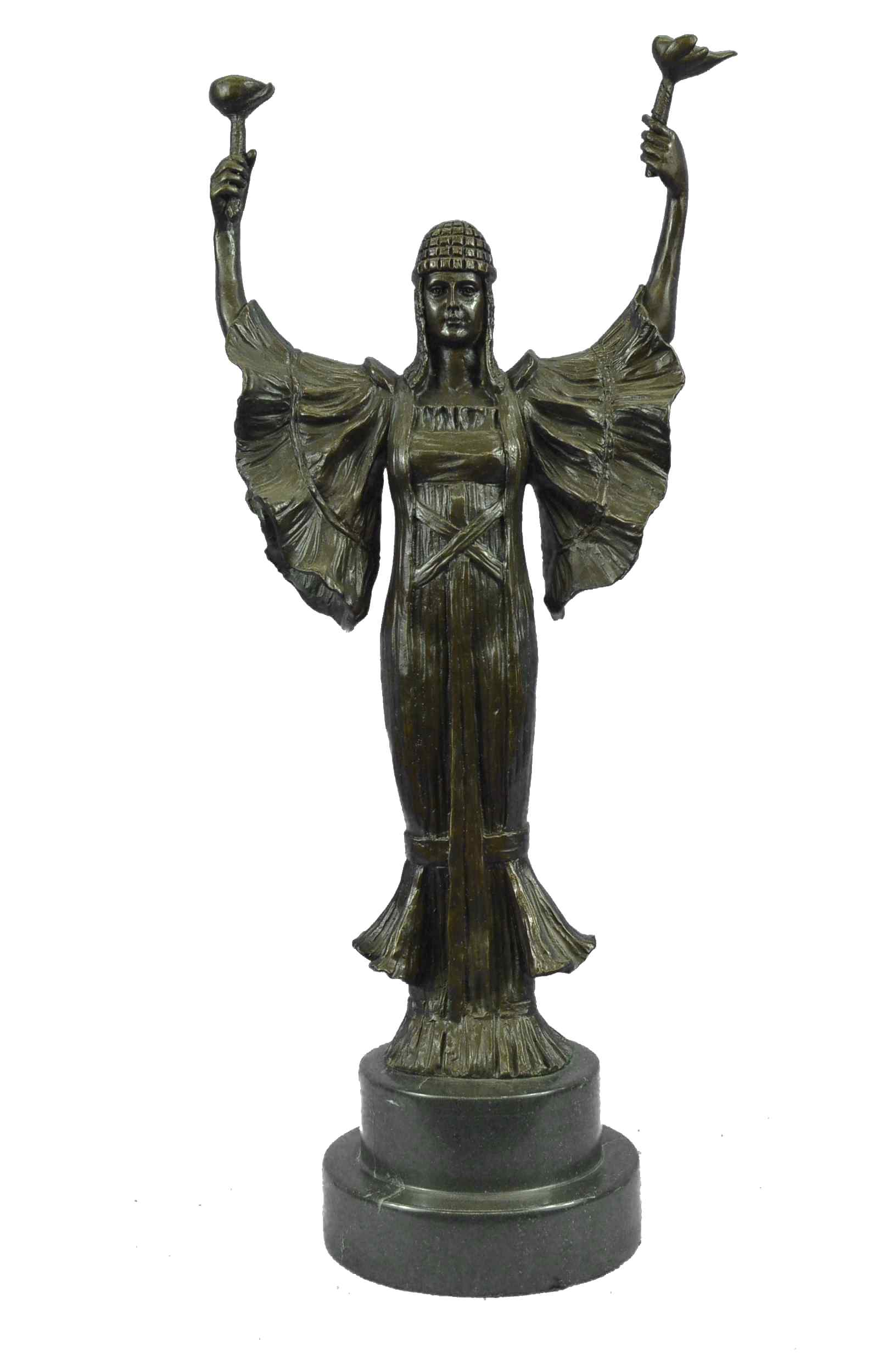 This beautiful sculpture of a woman standing with both her arms raised up as she holds to object on each is spectacular. She is wearing this long very elegant and Conservative dress that covers hers head to toes. It has these gorgeous ruffles on the wide sleeves that makes it hang low giving her a unique look. The dress has a criss cross right up front of it and it have different layers around the legs, with a very decorative hat to match. This sculpture was casted using the ancient "Lost Wax Method" and its stained in brown patina, 100% handmade and bronze. She is mounted on a triple black marble base, signed by the artist A. Leonard.Bronze Dimensions with Marble Base:Height 20 1/2" x Width 9"