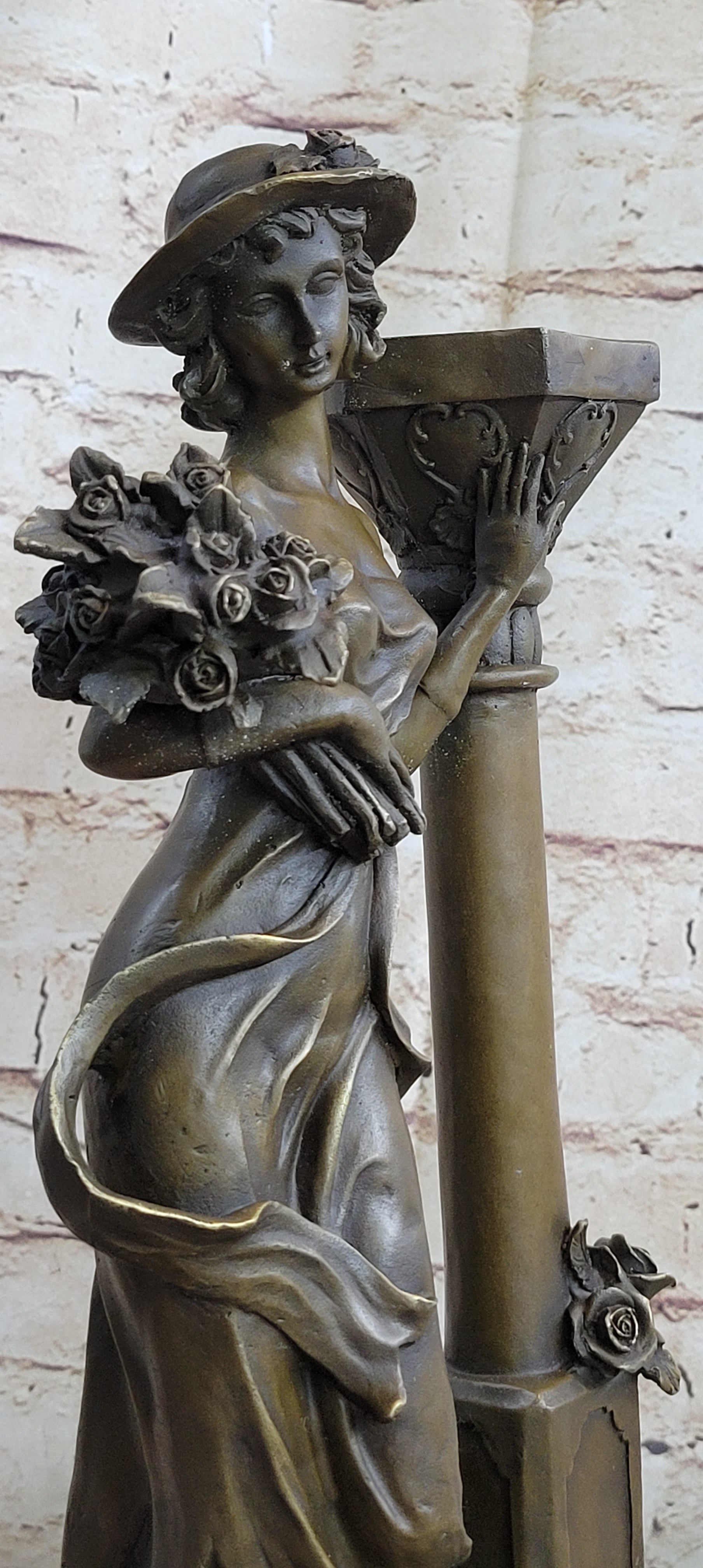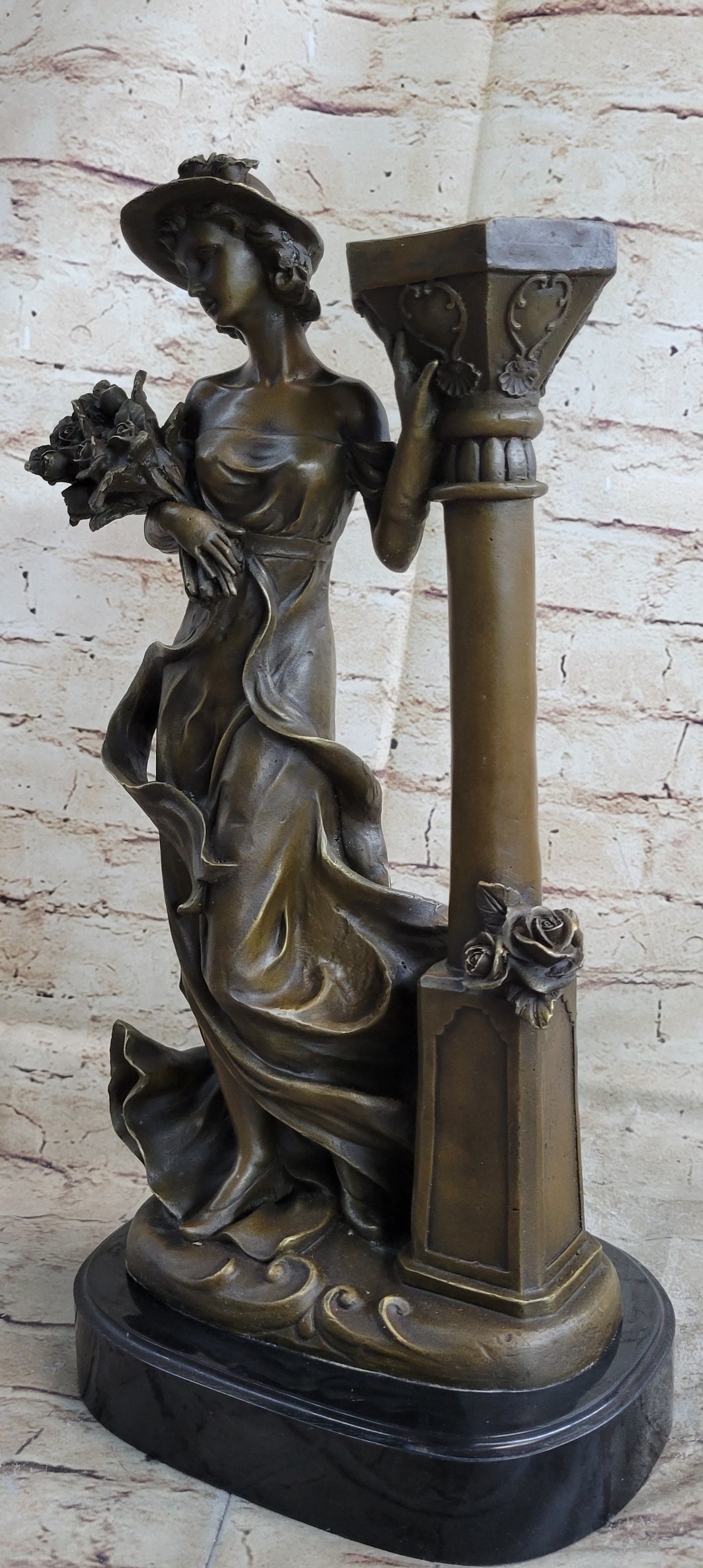 This exquisite bronze sculpture captures a breathtaking female figure standing gracefully beside a pillar, delicately holding a bouquet of flowers. Her elegant form is highlighted by an intricate dress that drapes beautifully over her body, accentuating her poise and confidence. The details in her sculpted physique, from her flat stomach to the soft curves of her silhouette, showcase the masterful artistry behind this piece.