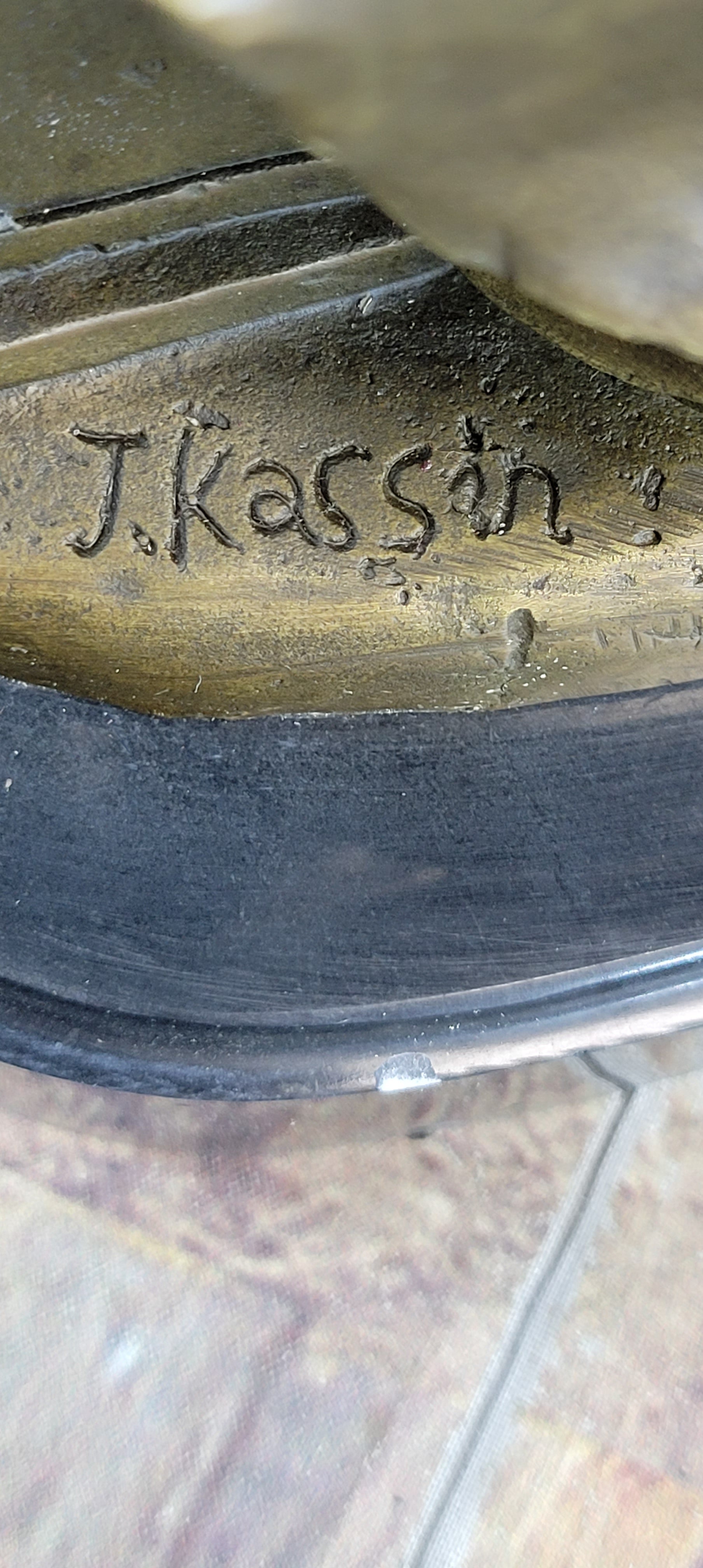 Signed by the artist J. Kassin, this timeless artwork embodies beauty, grace, and confidence, making it a perfect centerpiece for any art collection. Whether displayed in a home, office, or gallery, this captivating sculpture is sure to draw admiration and appreciation from all who see it.Bronze Dimensions with Marble Base: Height 16" X Width 8"