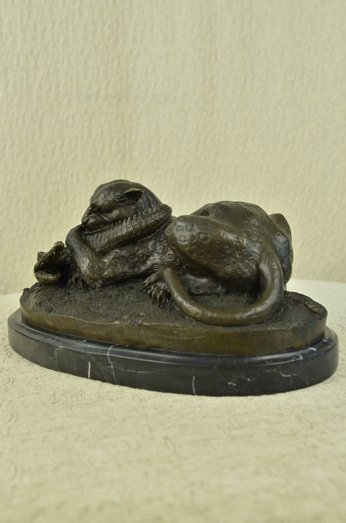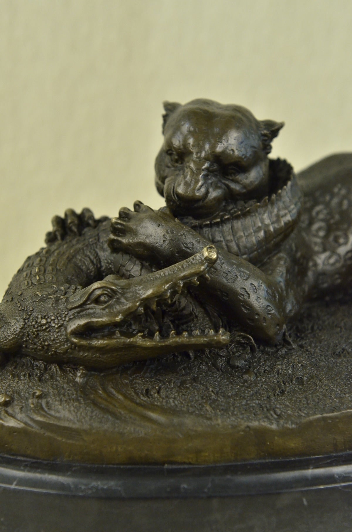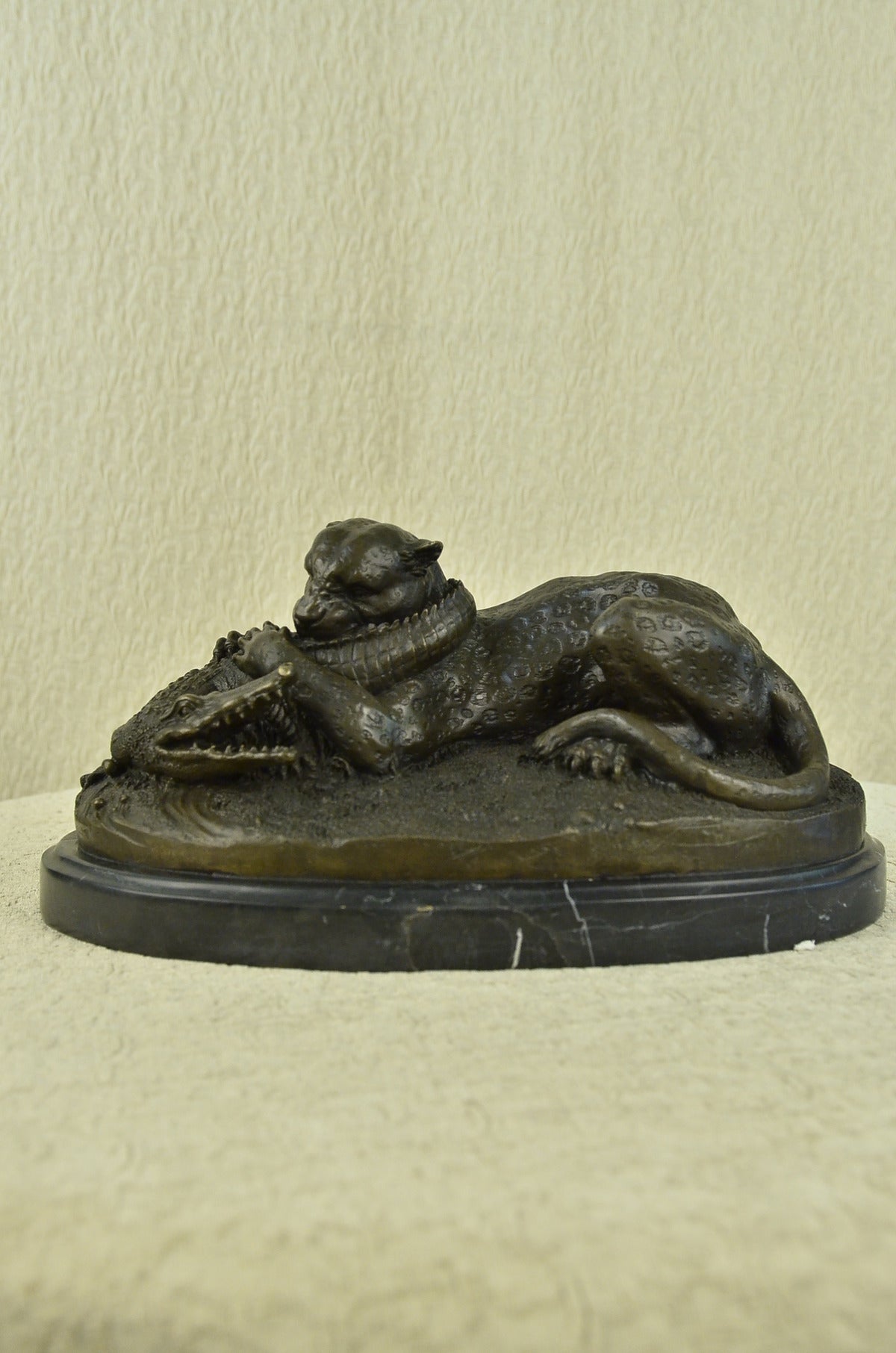 A fierce battle has broken out between two known killers. Reptile vs. Wild Cat. A snapping alligator and a prowling cheetah. Venomous enemies, they are locked in a fight to the death. The alligator, a large reptile that lives near water, has thick scaly skin, powerful jaws, a long tail is nowhere near surrender. That strong whipping tail is coiled around the cheetah’s neck. If you poke a finger in its wide open, snarling mouth, you can feel the jagged edges of the toothed jaw mainly used for gripping or crushing. The fast African wild cat: a large member of the cat family with a spotted coat, small head, slender body, and long legs that is the fastest land mammal, digs its claws into the alligator’s back. Unfazed by the alligator’s snapping jaws and choking tail, the cheetah clamps its blood-thirsty teeth into its tail. The relaxed demeanor of the cheetah, sitting with its hind legs beneath it and tail resting on one paw, tells us who’s winning this fight. 100% Handmade and fully detailed brown patina with touches of gold, using the Lost wax Method. It is mounted on a wide round black marble base and signed Barye .Bronze Dimensions with Marble Base:Height 8" X Width 15"