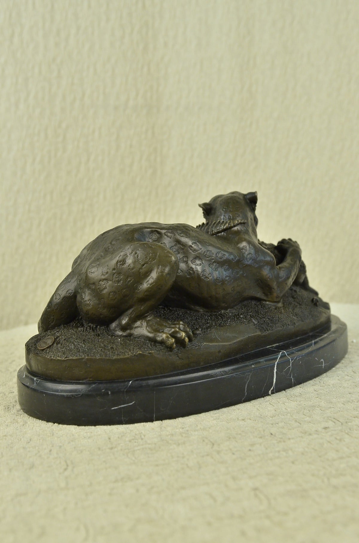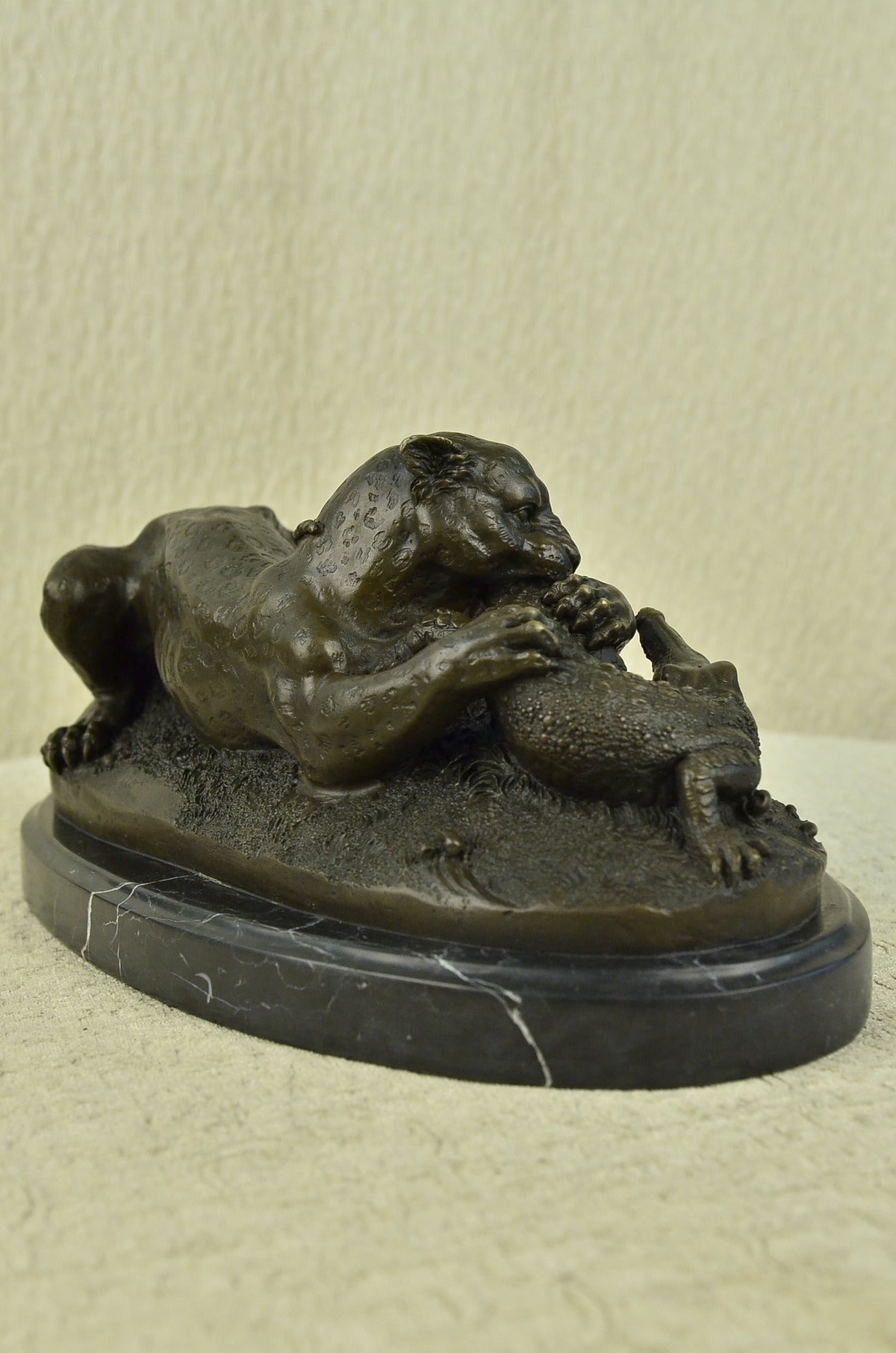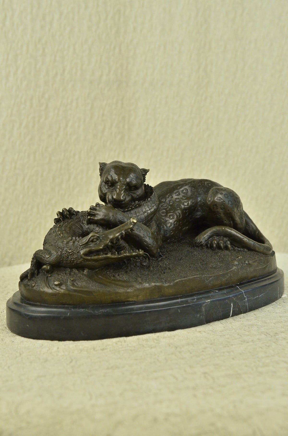 A fierce battle has broken out between two known killers. Reptile vs. Wild Cat. A snapping alligator and a prowling cheetah. Venomous enemies, they are locked in a fight to the death. The alligator, a large reptile that lives near water, has thick scaly skin, powerful jaws, a long tail is nowhere near surrender. That strong whipping tail is coiled around the cheetah’s neck. If you poke a finger in its wide open, snarling mouth, you can feel the jagged edges of the toothed jaw mainly used for gripping or crushing. The fast African wild cat: a large member of the cat family with a spotted coat, small head, slender body, and long legs that is the fastest land mammal, digs its claws into the alligator’s back. Unfazed by the alligator’s snapping jaws and choking tail, the cheetah clamps its blood-thirsty teeth into its tail. The relaxed demeanor of the cheetah, sitting with its hind legs beneath it and tail resting on one paw, tells us who’s winning this fight. 100% Handmade and fully detailed brown patina with touches of gold, using the Lost wax Method. It is mounted on a wide round black marble base and signed Barye .Bronze Dimensions with Marble Base:Height 8" X Width 15"