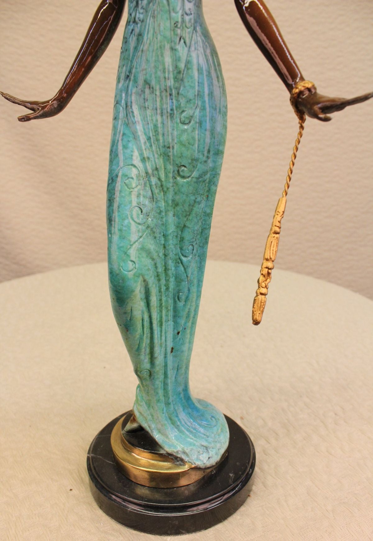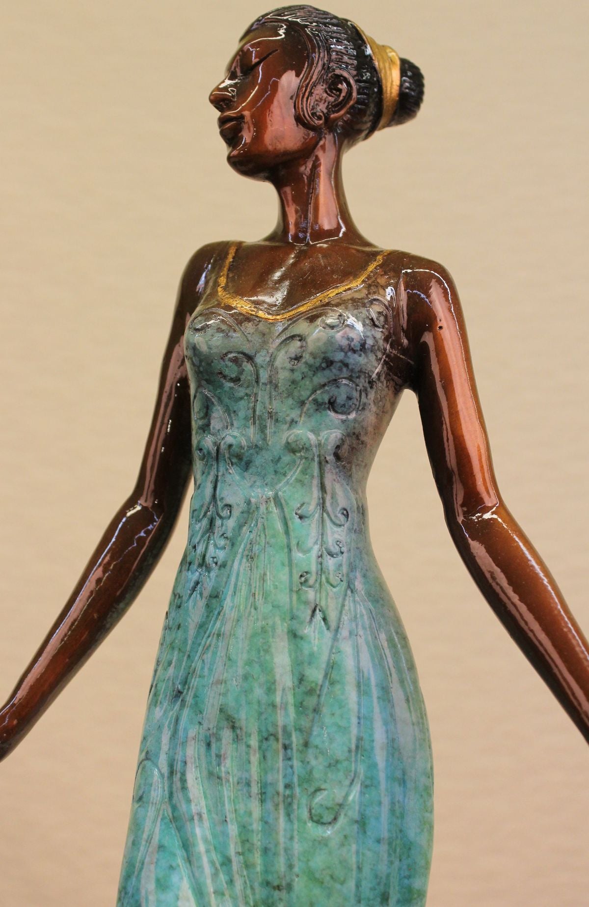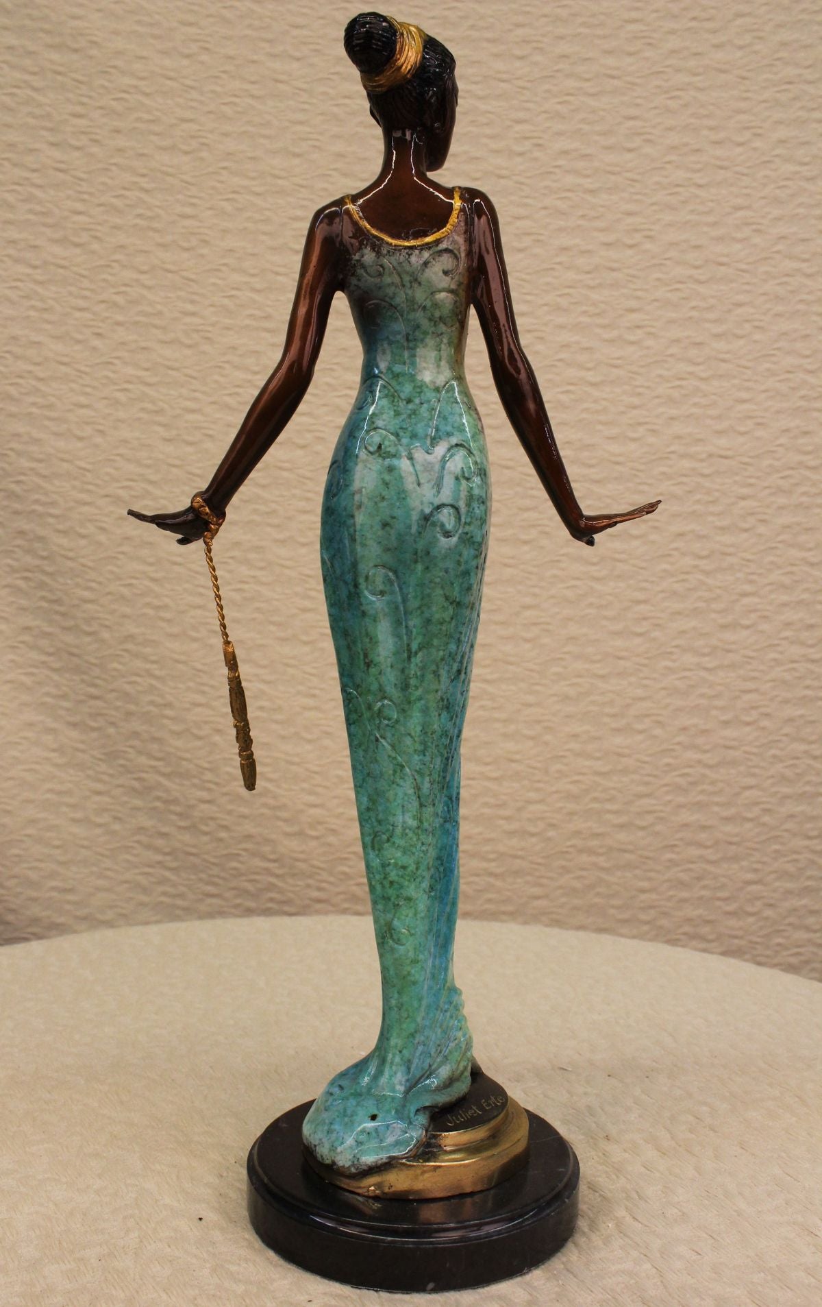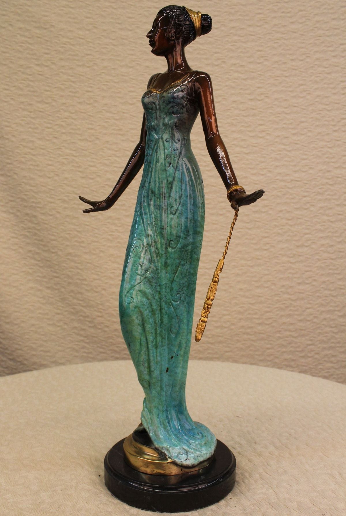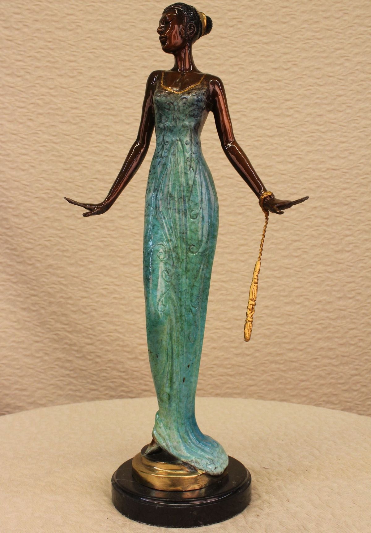 She is most certainly not another brick in the wall, but here to define herself as a timeless individual. She stands tall with impeccable posture, draped in a delicate, defined dress, with a detailed, matching head piece. The tail of her dress gently swarms the surrounding area by her feet, which are covered by sophisticated heels to put the finishing touches on her effeminate appearance. Her strong, yet delicate hands have the power to halt any man who dare think he is worthy of entering her presence, along with the calm, blank stare in her face which defines her serious demeanor. The statue is made completely of lost wax, with a crisp patina texture, placed upon sleek marble base.Original or Reproduction: Reproduction