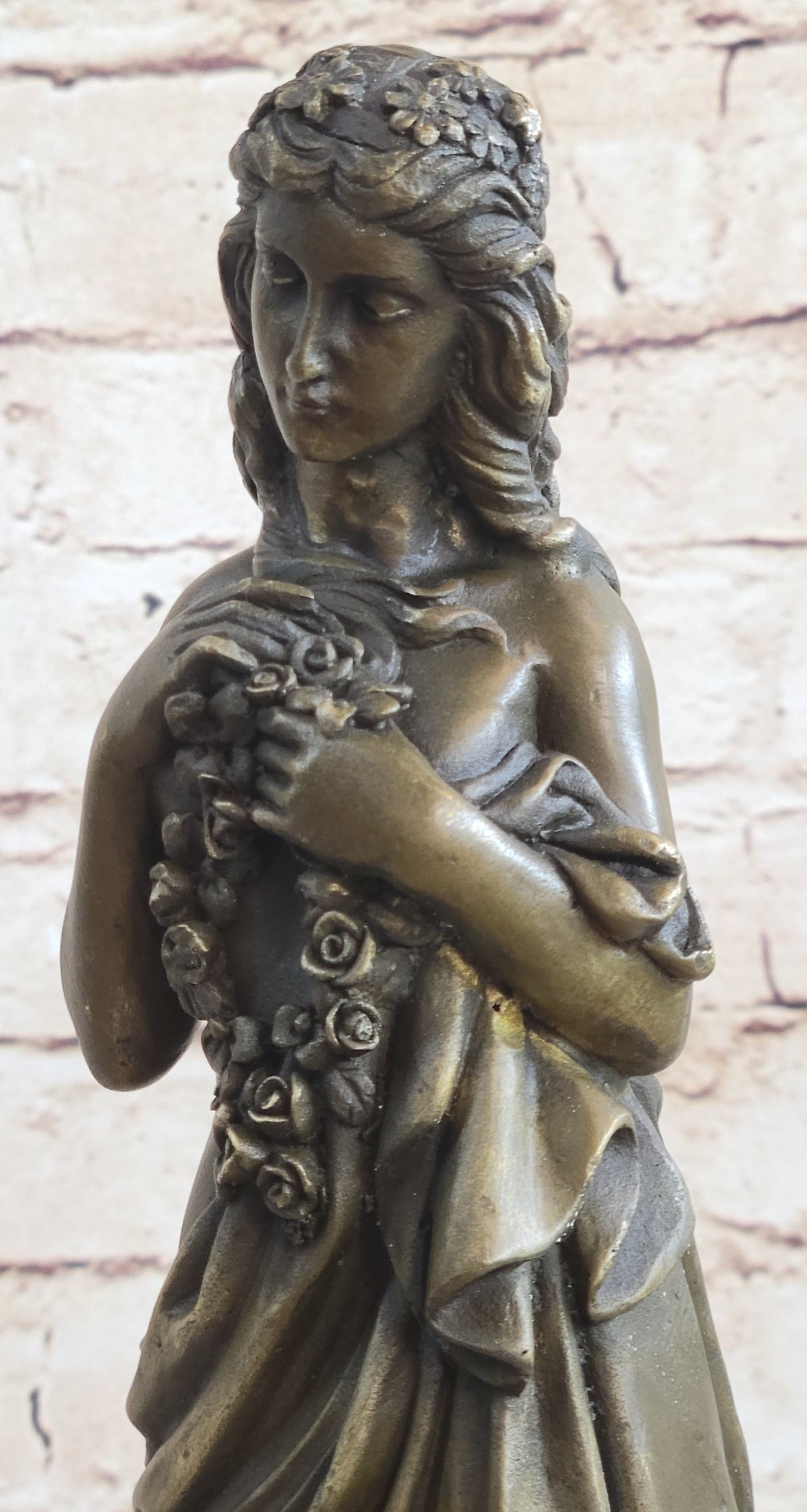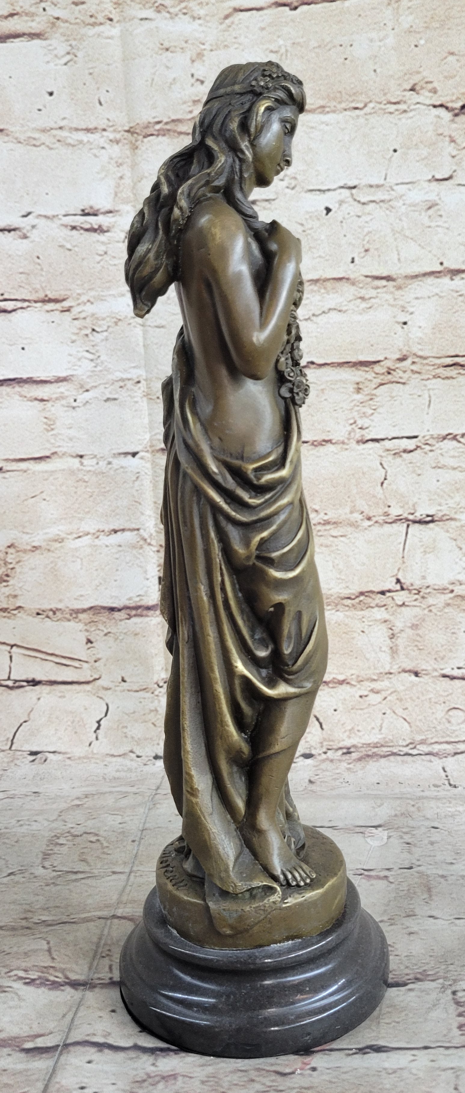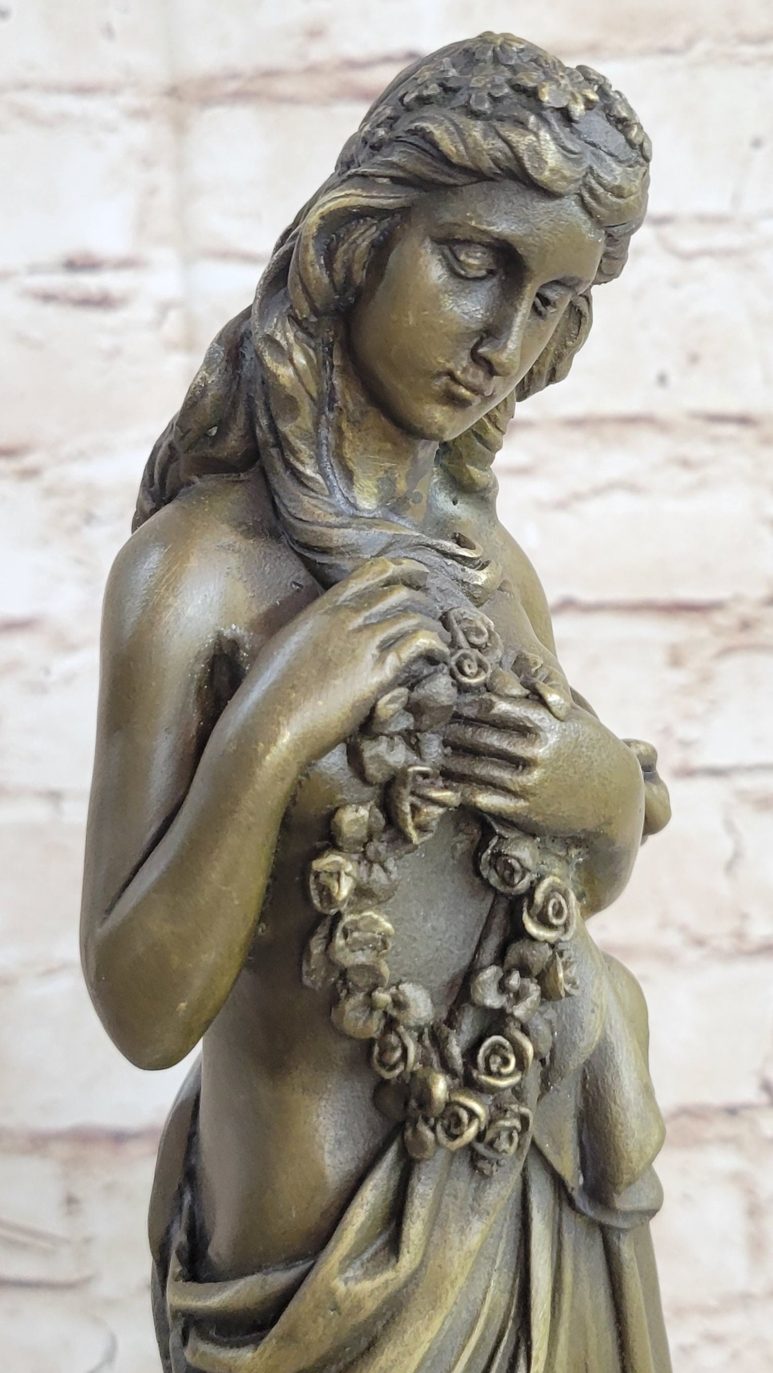 This classical bronze sculpture captures the essence of a young maiden in a moment of deep contemplation. Her graceful posture, with one foot slightly forward and her delicate hands holding a rope of flowers, evokes a sense of melancholic introspection. The long robe slipping off her slender frame symbolizes vulnerability and the weight of her thoughts. Her downcast eyes convey a profound sense of sadness and introspection, as if she is searching for answers within her own heart.