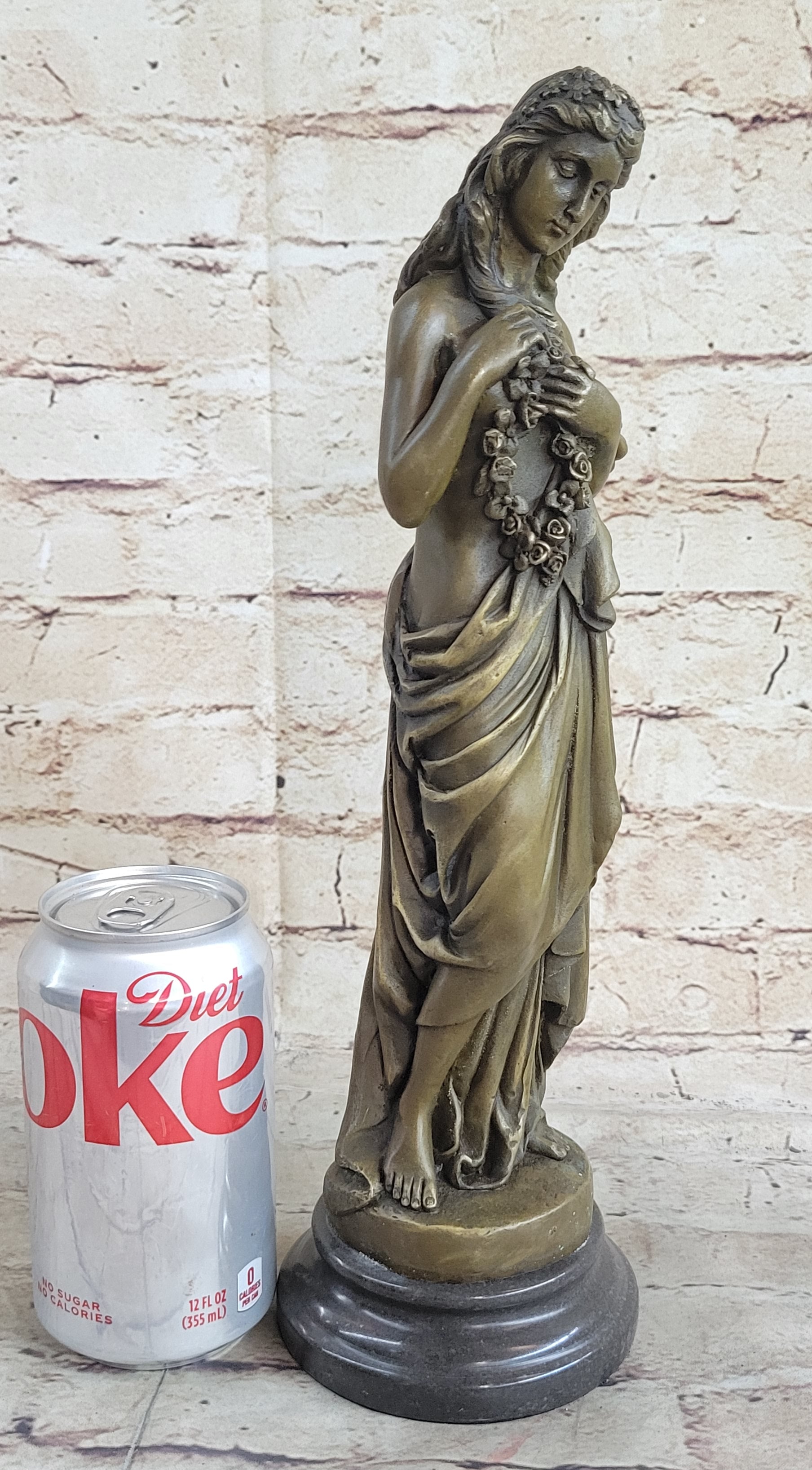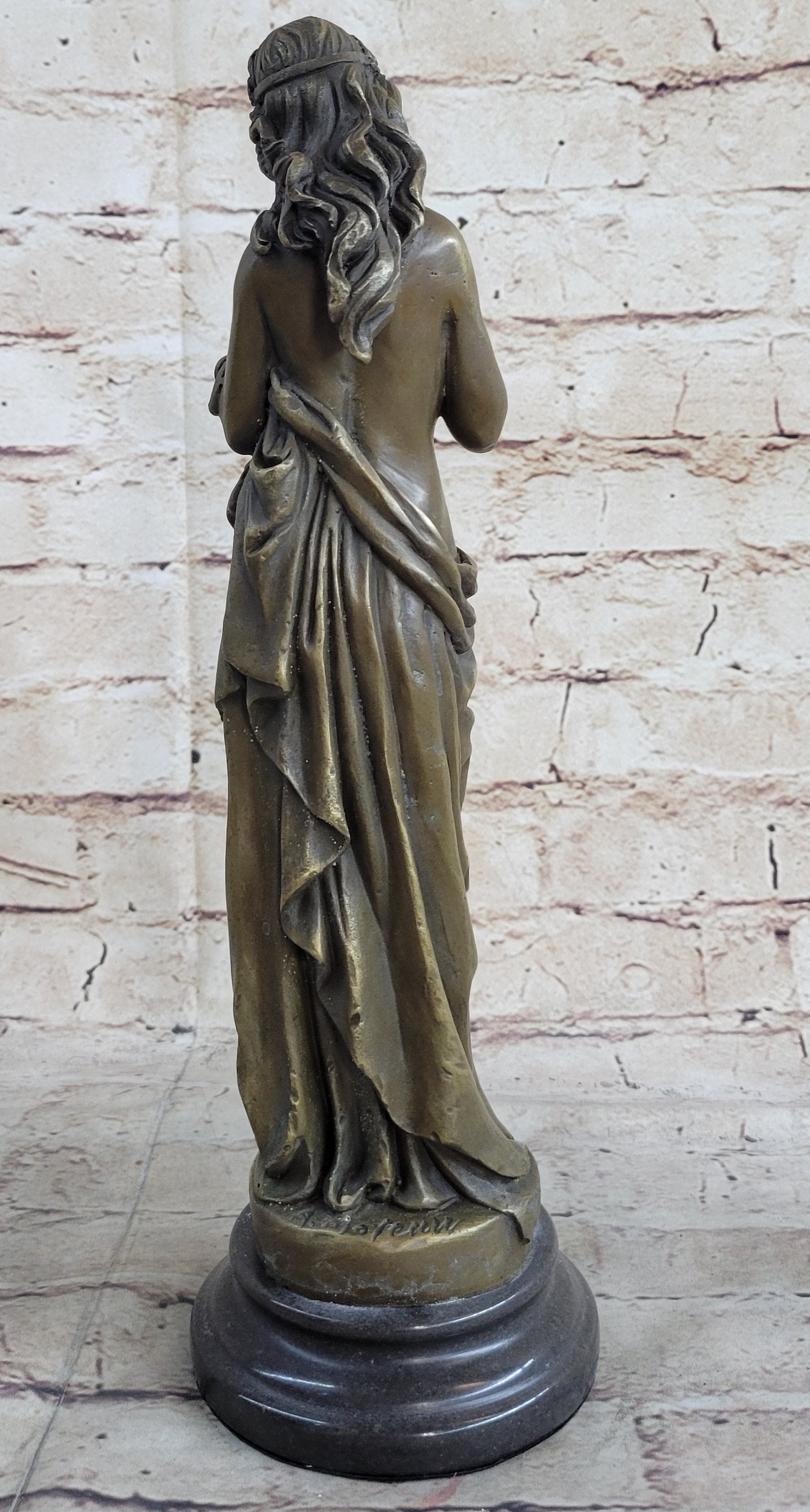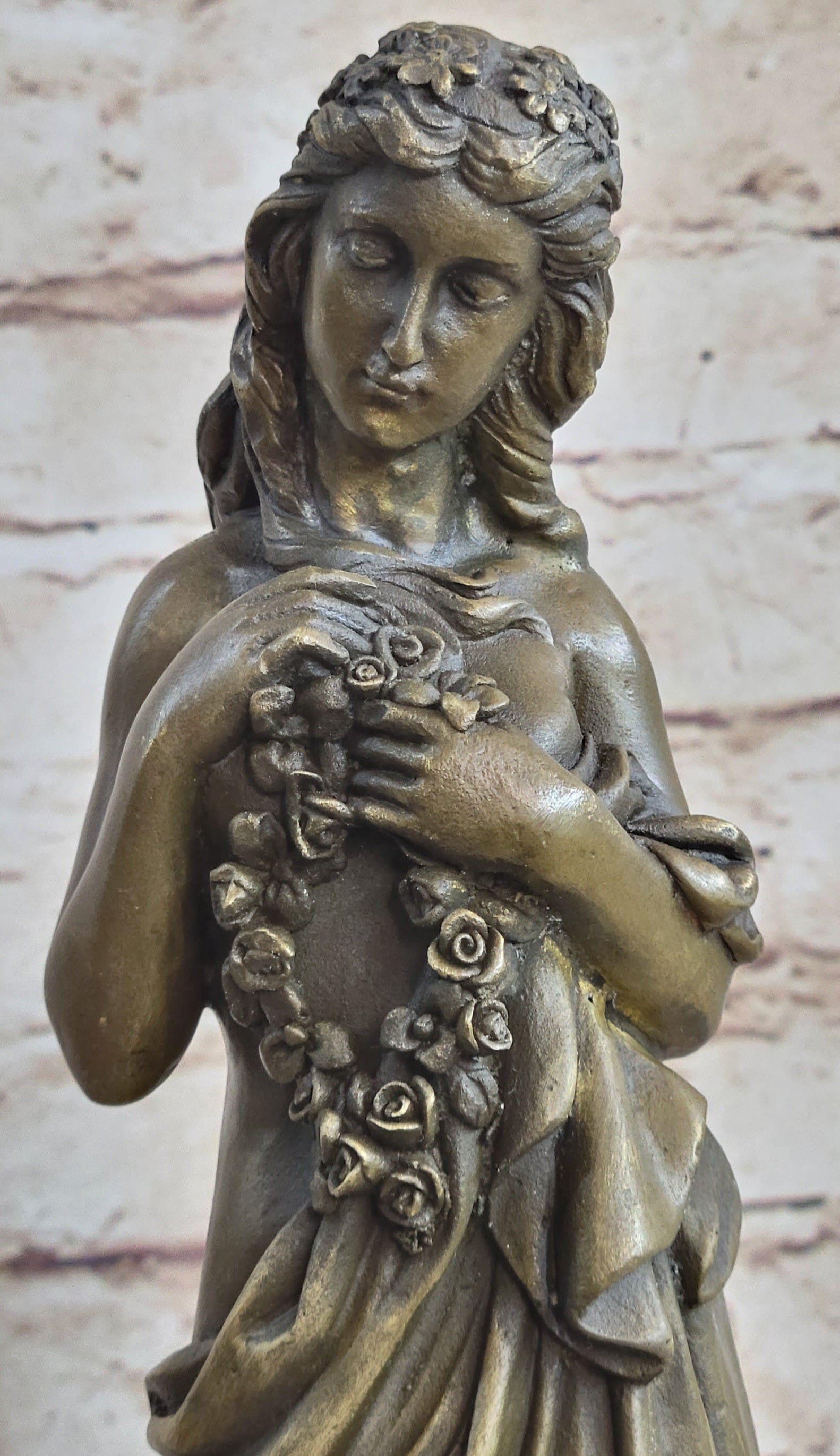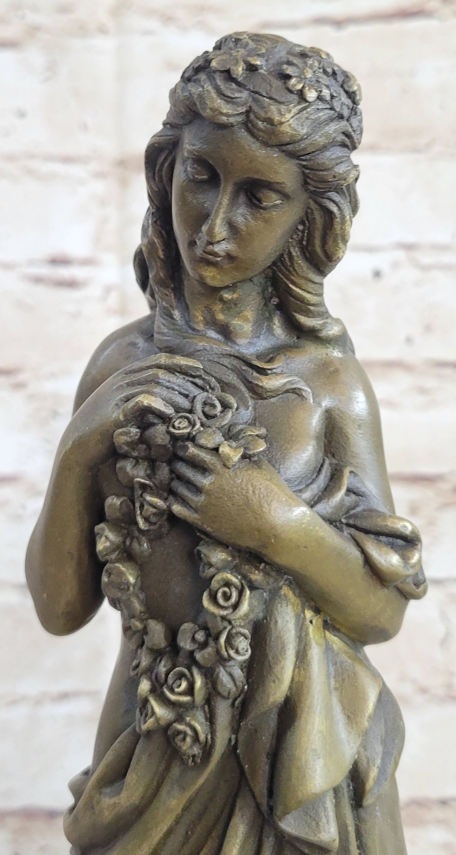 This classical bronze sculpture captures the essence of a young maiden in a moment of deep contemplation. Her graceful posture, with one foot slightly forward and her delicate hands holding a rope of flowers, evokes a sense of melancholic introspection. The long robe slipping off her slender frame symbolizes vulnerability and the weight of her thoughts. Her downcast eyes convey a profound sense of sadness and introspection, as if she is searching for answers within her own heart.