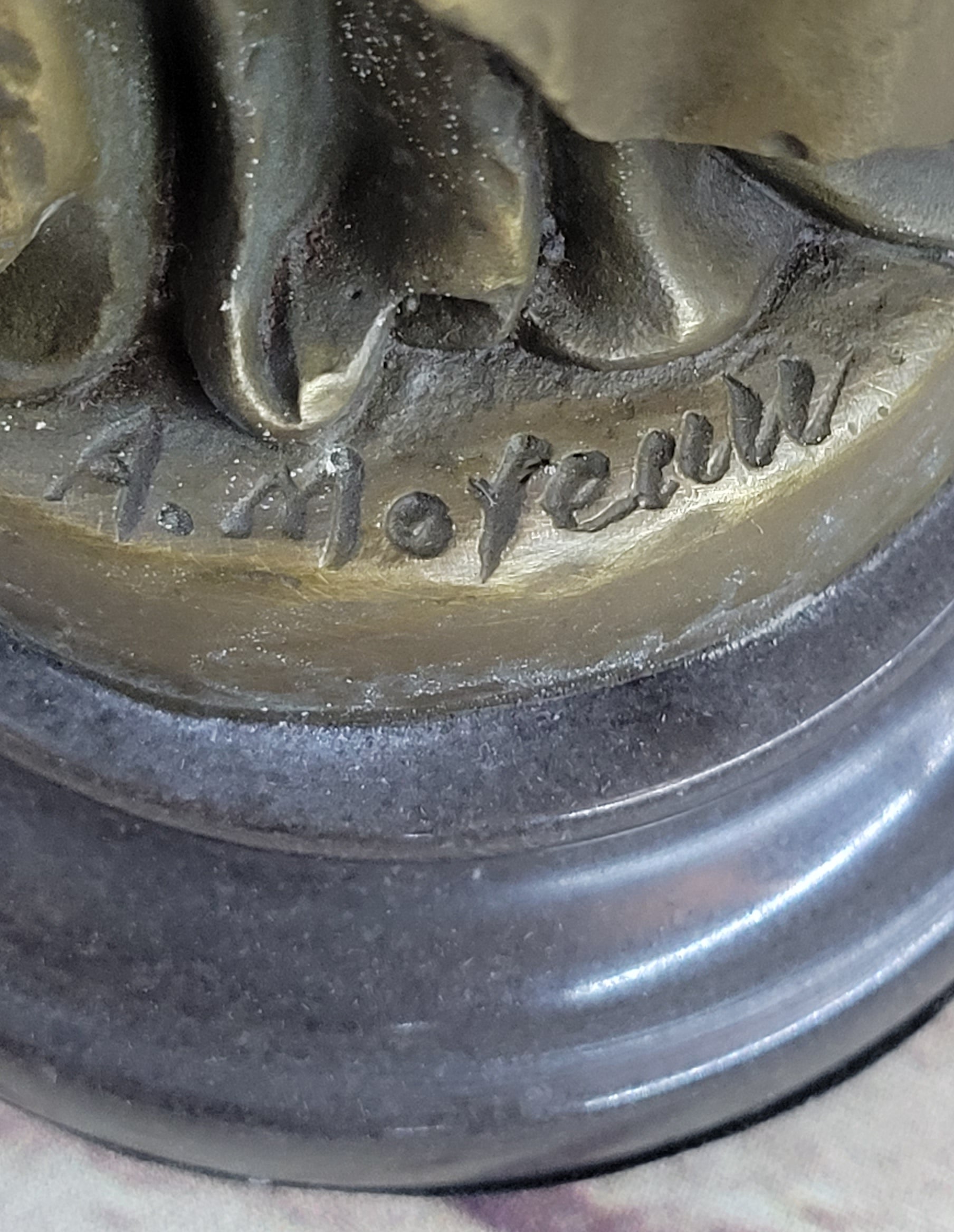 Crafted using the time-honored lost-wax casting method, this sculpture showcases exquisite detailing and a rich brown patina finish that enhances its emotional depth. Mounted on a sleek black marble base, this piece is a testament to the artist A. Moreau's skill and ability to capture the complexity of human emotions. Whether displayed in your home or as part of your art collection, this sculpture will undoubtedly leave a lasting impression with its timeless beauty and poignant portrayal of the human experience.Bronze Dimensions with Marble Base: Height 13" X Width 4"