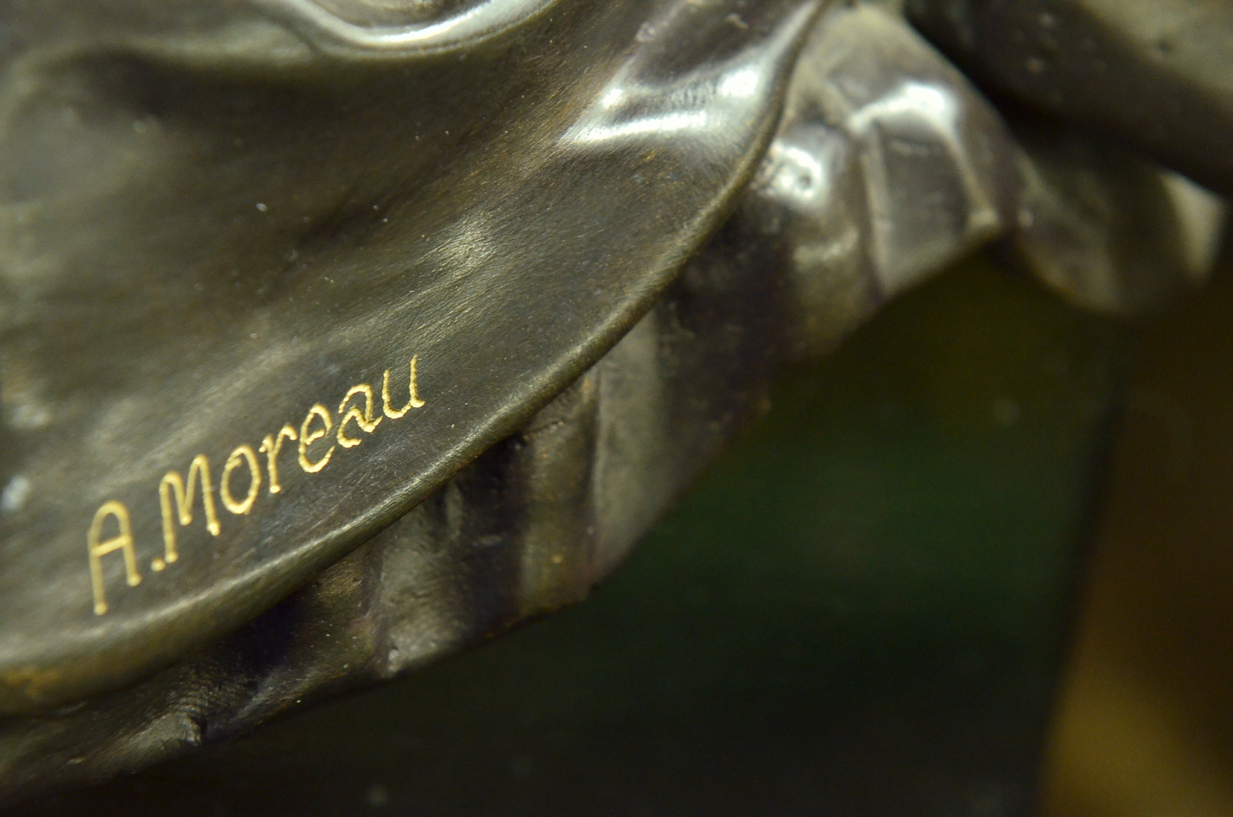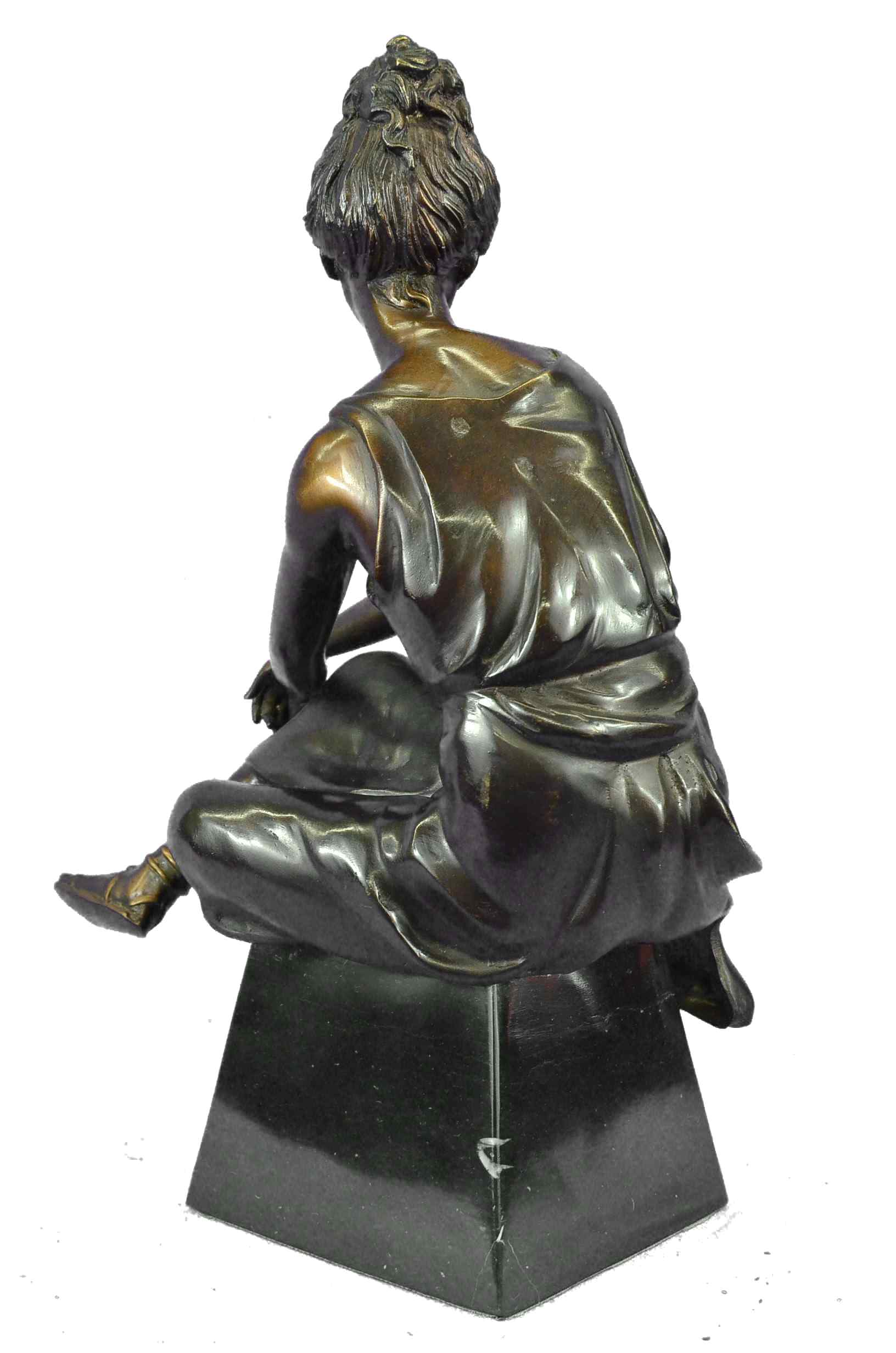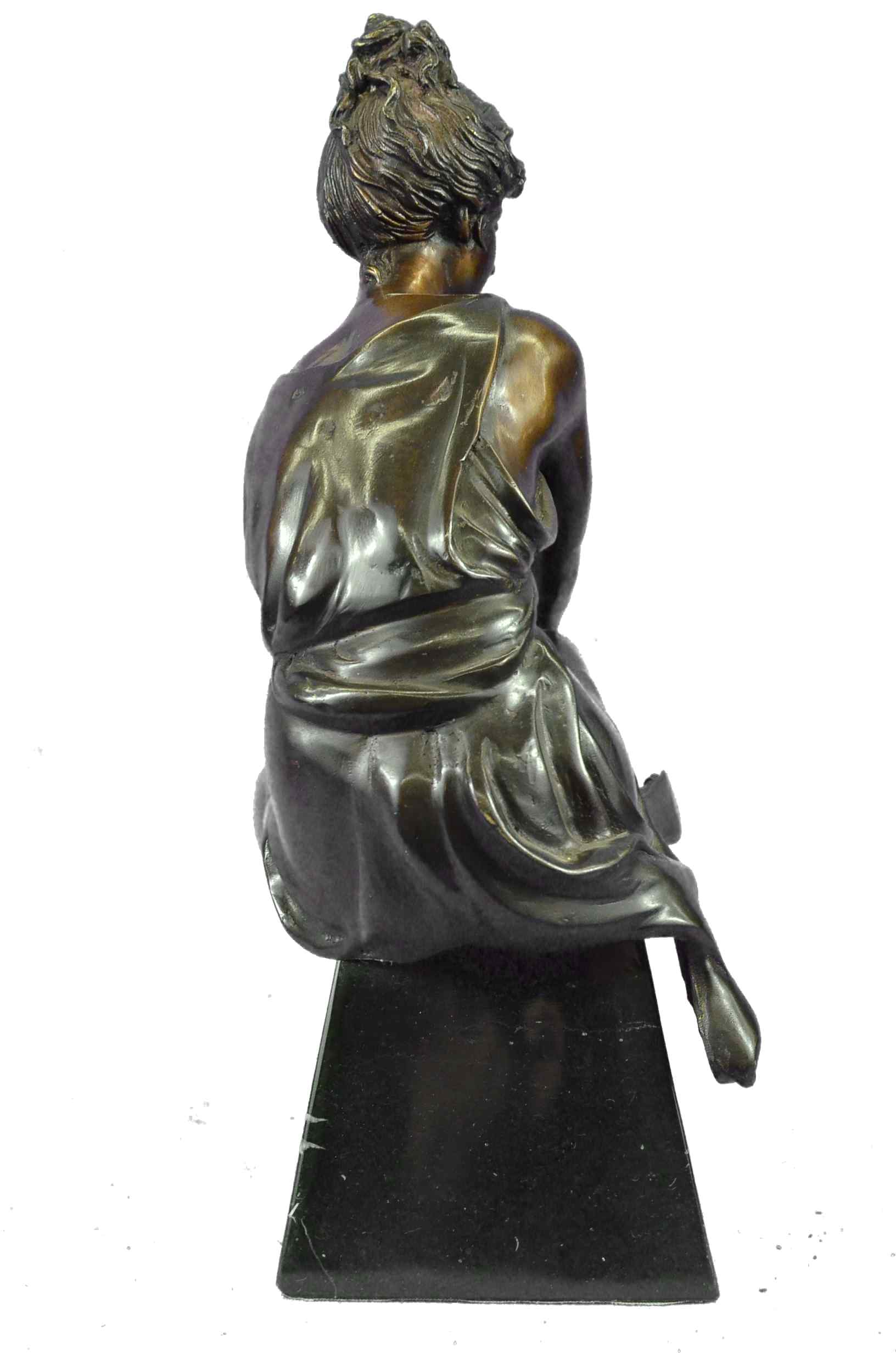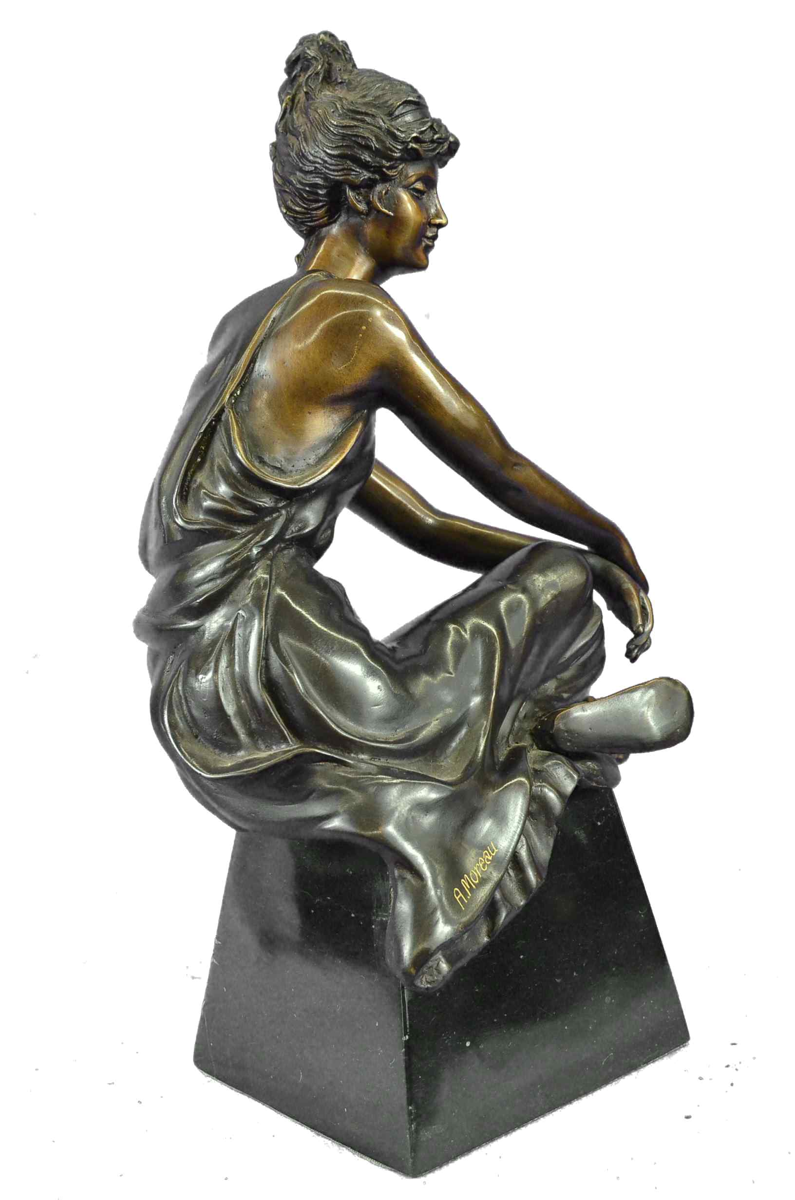 She is an artist`s muse. She poses for a painting, sitting before his easel. She is perched on a sheet, which is spread across a bench. She hikes a knee up and gently cradles it under her arm. Her long silky hair cascades over it, shielding most of her nude body. Her free long leg dangles over the side. She is at peace in her natural state of beauty and is comfortable being the inspiration for the strokes of his paintbrush. She is a fully-detailed brown patina and mounted on a black marble base. 100% bronze and handmade, she was cast using the "Lost Wax Method and is signed A Moreau.Original or Reproduction: Reproduction