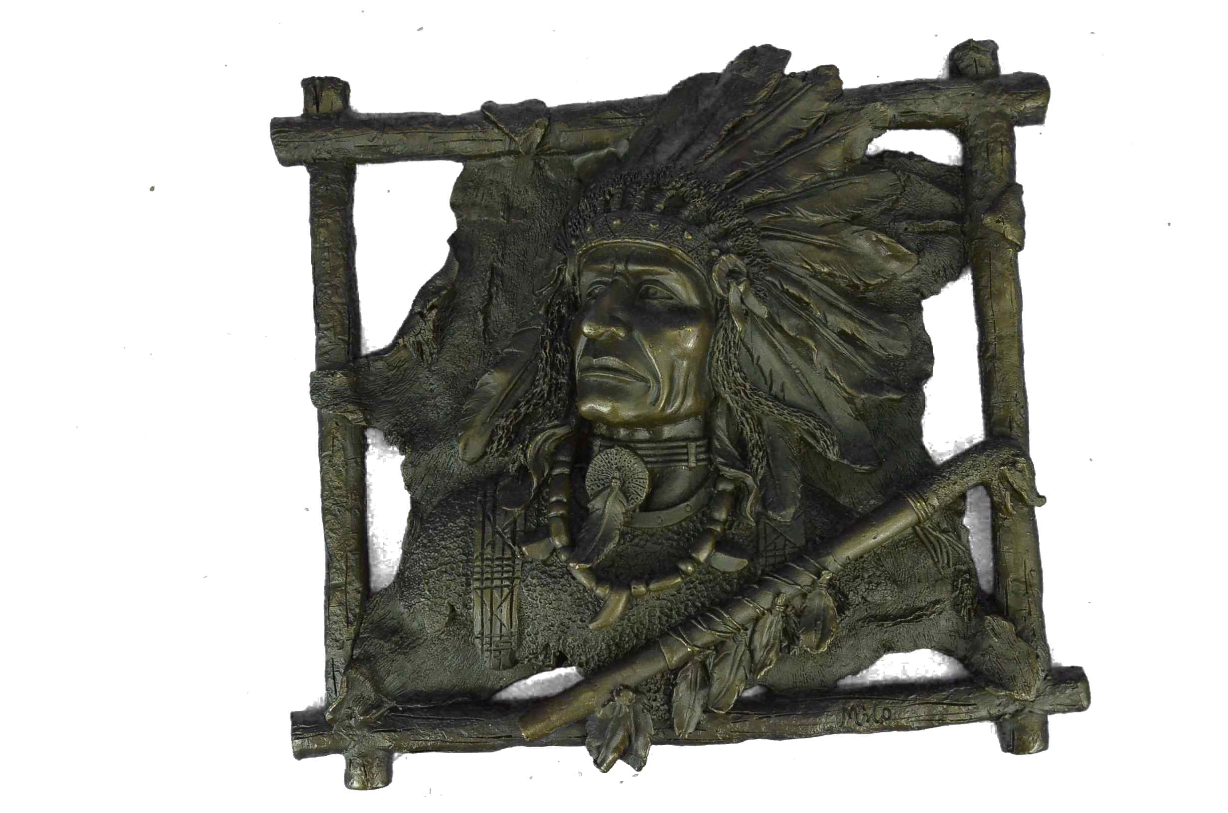 Wall Mount Native Indian Chief with peace Pipe Bronze Sculpture Statue Figurine