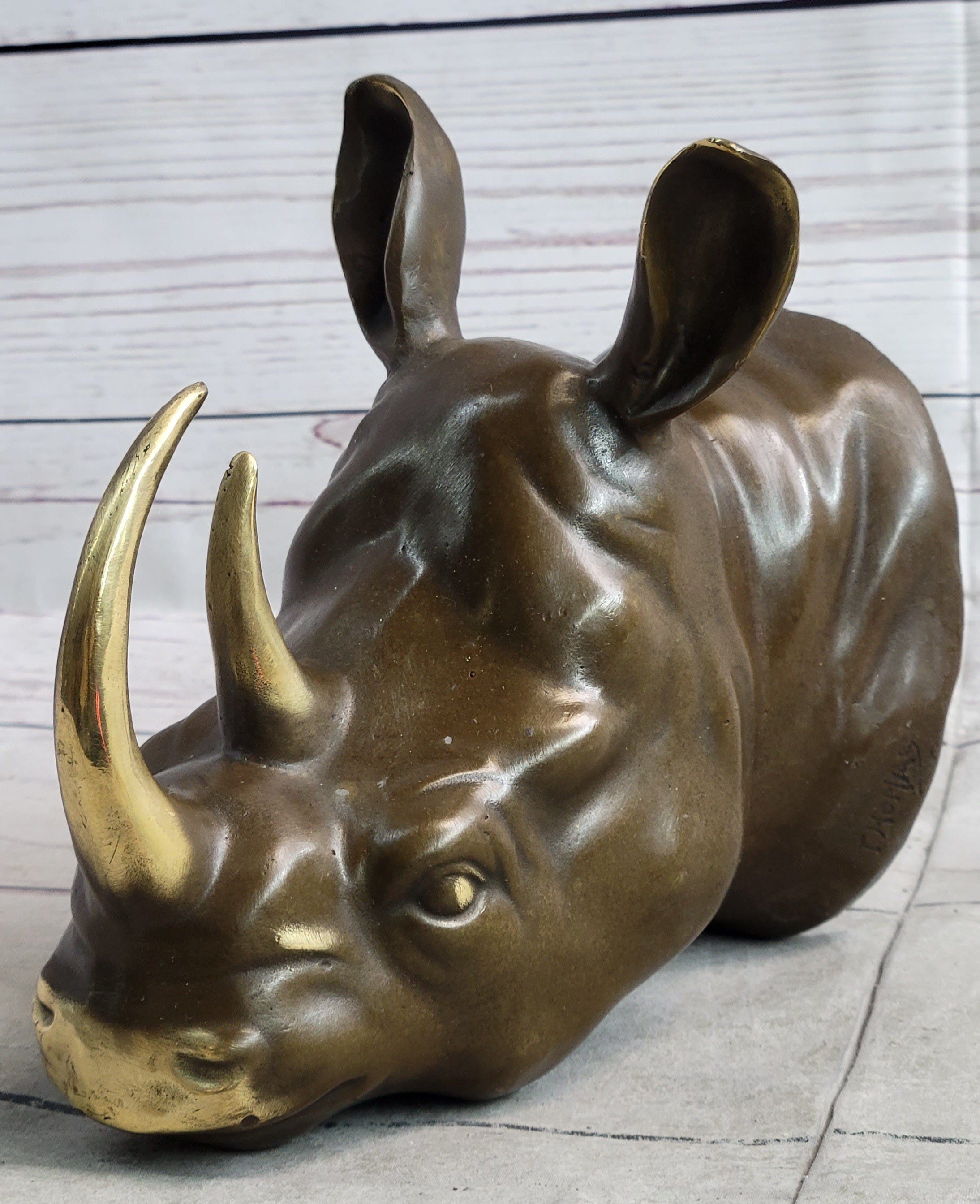 Discover the allure of nature's might embodied in this remarkable bronze rhinoceros head sculpture. Its compact size allows it to easily fit into various spaces while retaining an awe-inspiring presence. The sculpture's skillful craftsmanship captures every nuance of the rhinoceros' distinctive features, making it a striking and easily recognizable accent in any room or outdoor area. Through the time-honored lost wax technique, this artwork is brought to life with unparalleled authenticity, carrying the signature of the talented artist Milo. Add a touch of wildlife magnificence to your surroundings with this captivating bronze creation.