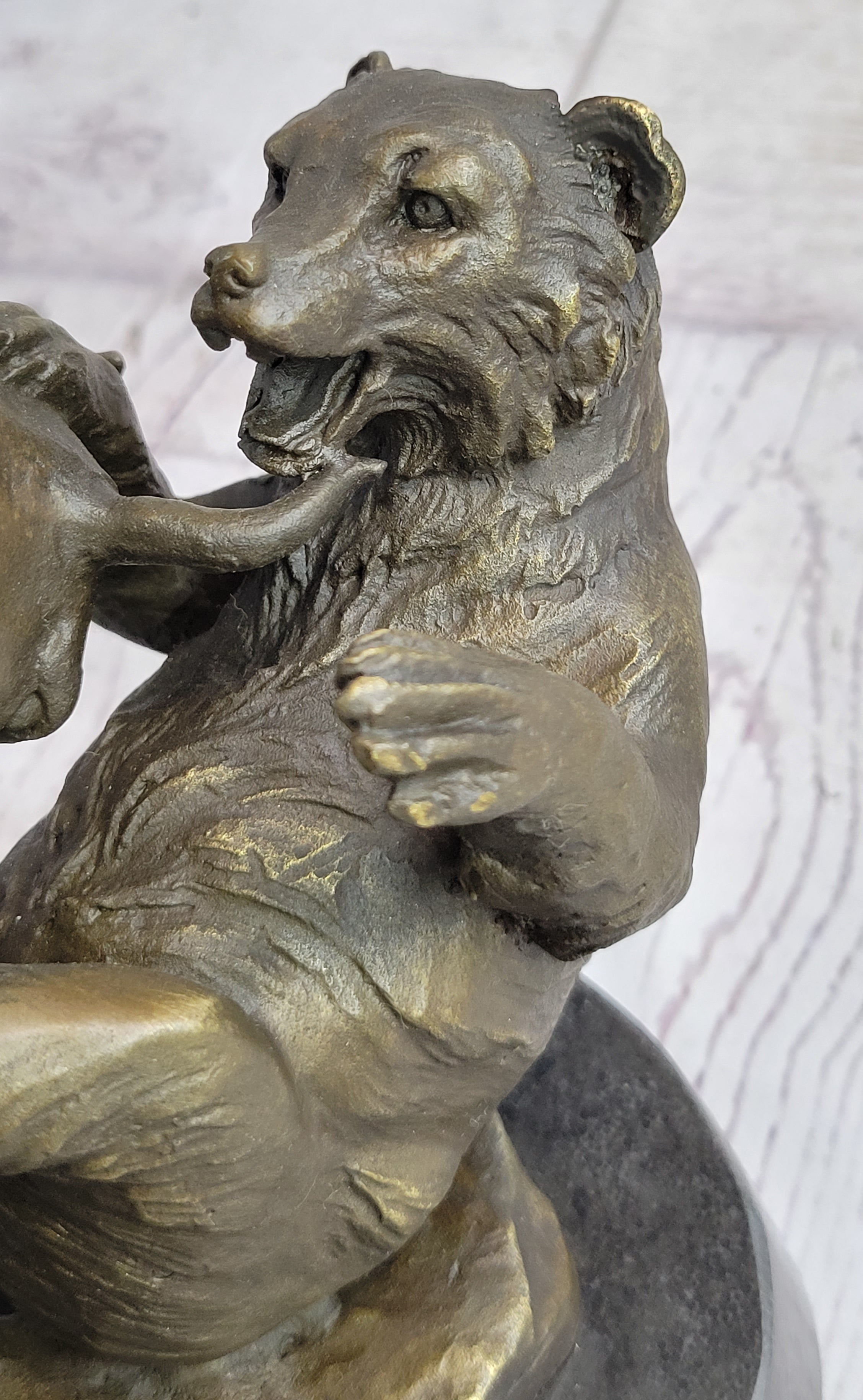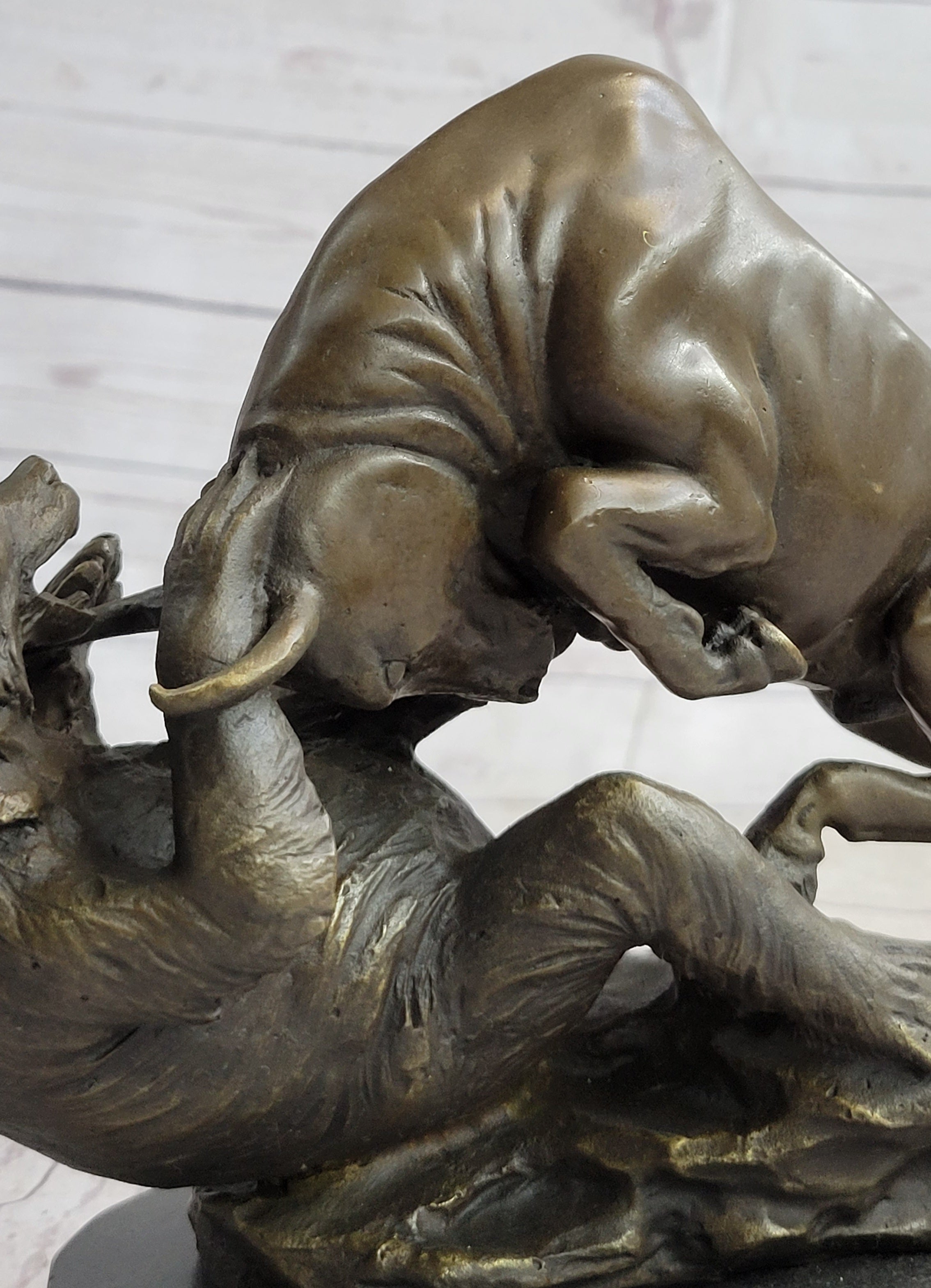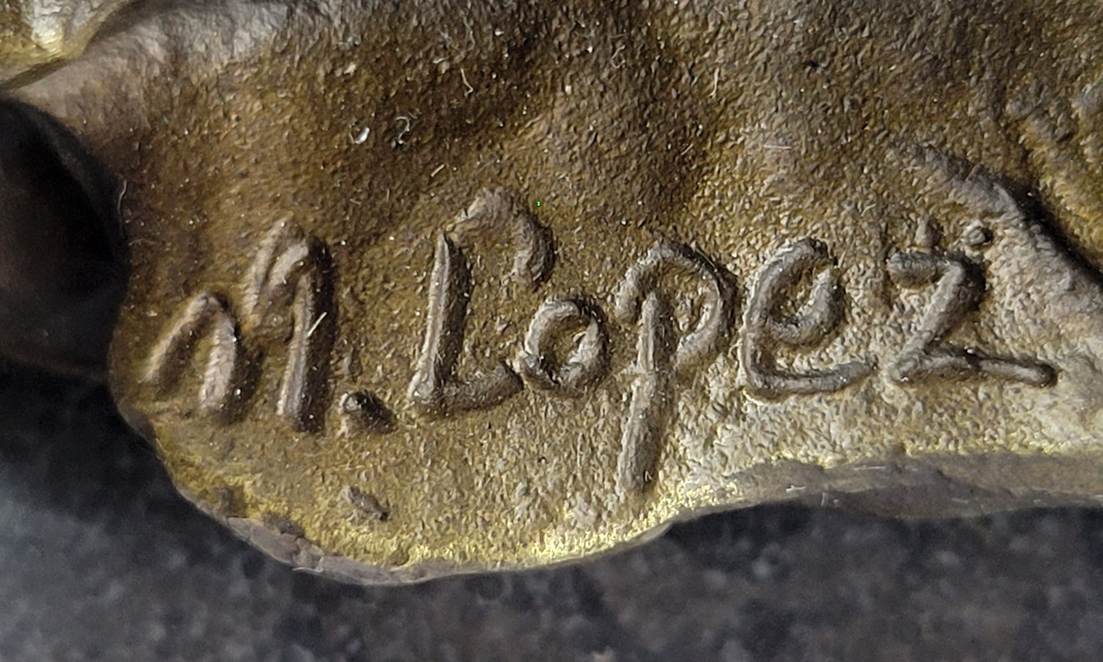 Meticulously handcrafted from start to finish, this remarkable artwork is made entirely of 100% bronze. The esteemed "Lost Wax Method" was utilized to cast this masterpiece, ensuring the preservation of intricate details and artistic expression. Resting upon a wide, round black marble base, the sculpture exudes stability and elegance. It bears the signature of the talented artist, Lopez, a testament to the craftsmanship and passion infused into this extraordinary piece.Bronze Dimensions with Marble Base: Height 9" X Width 11"