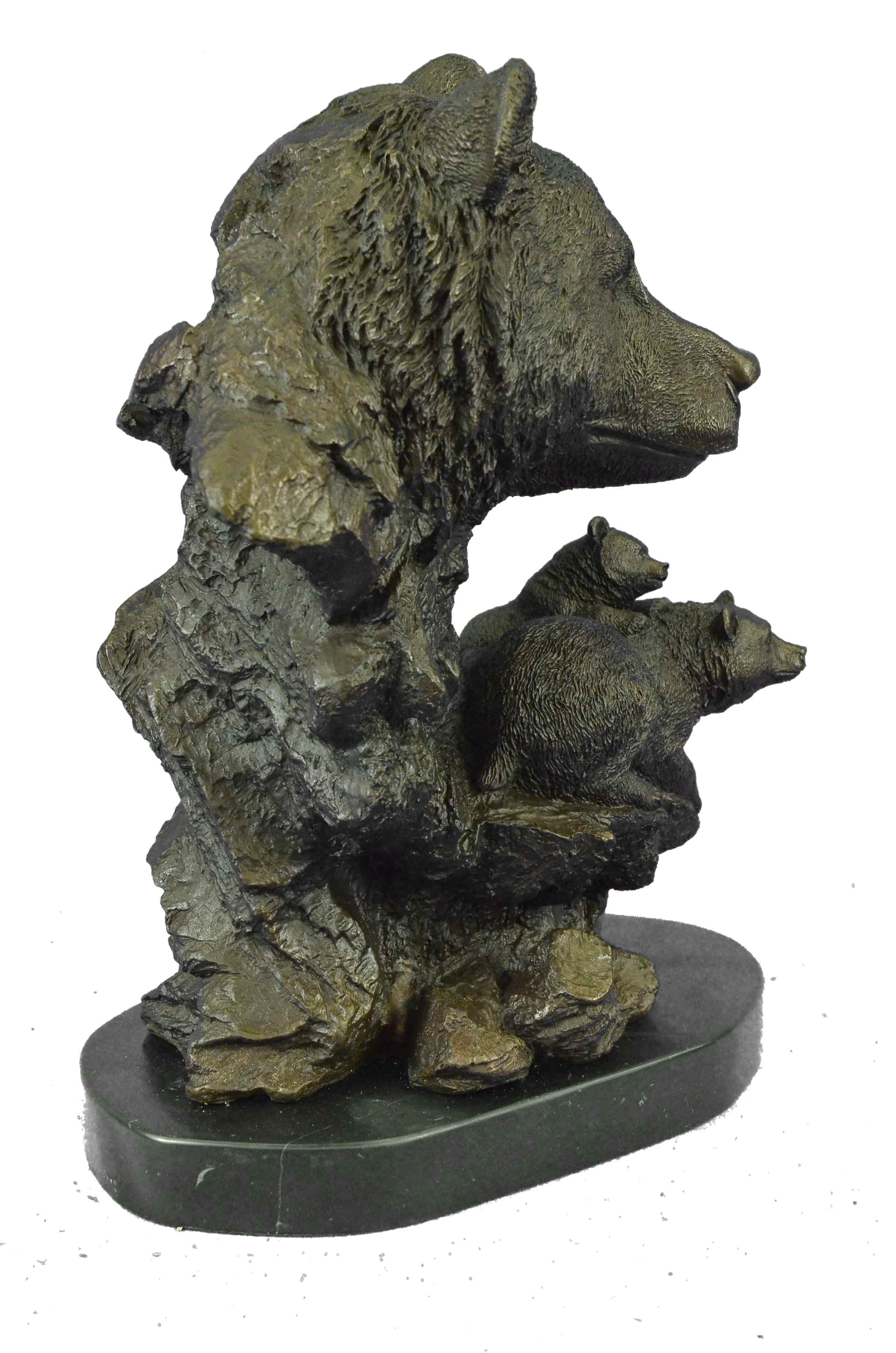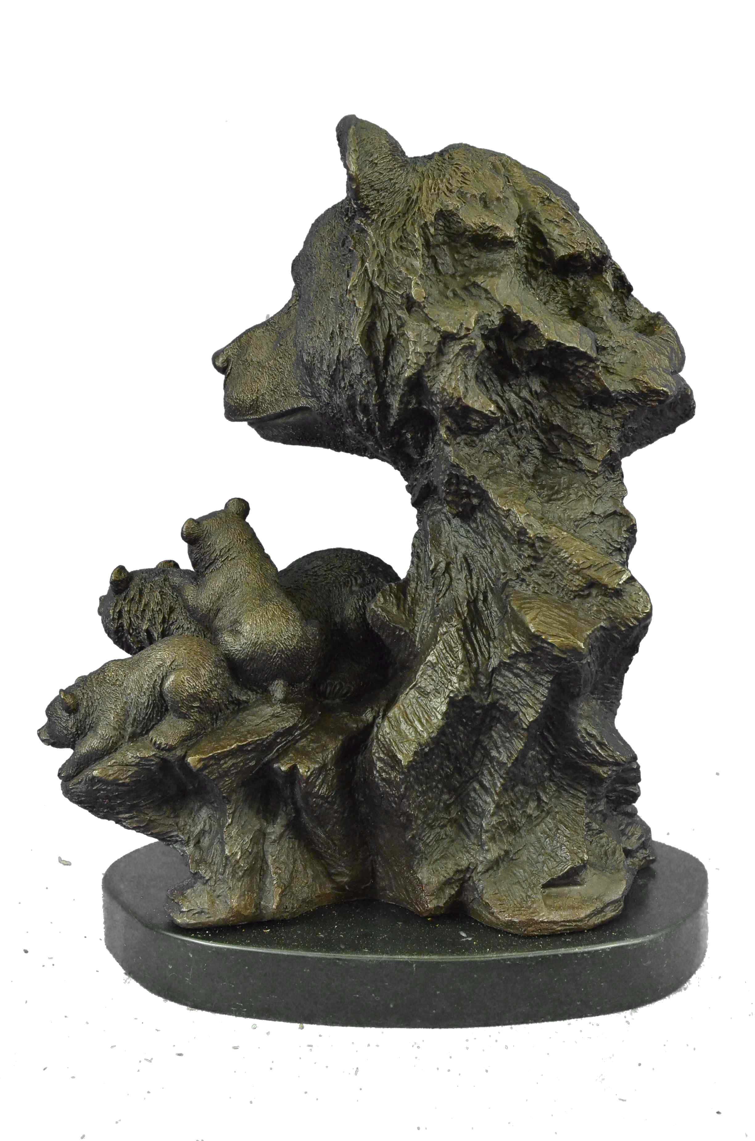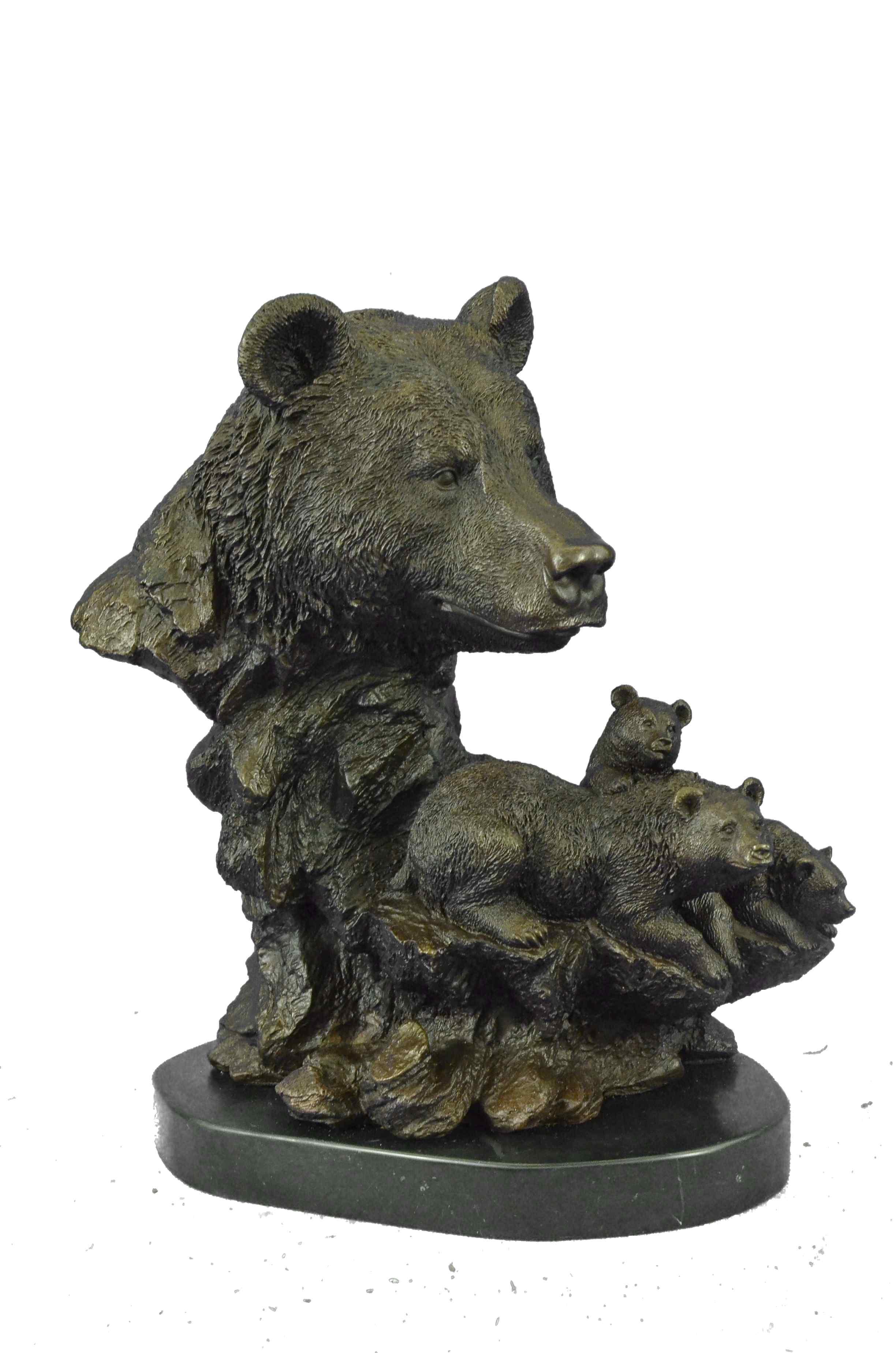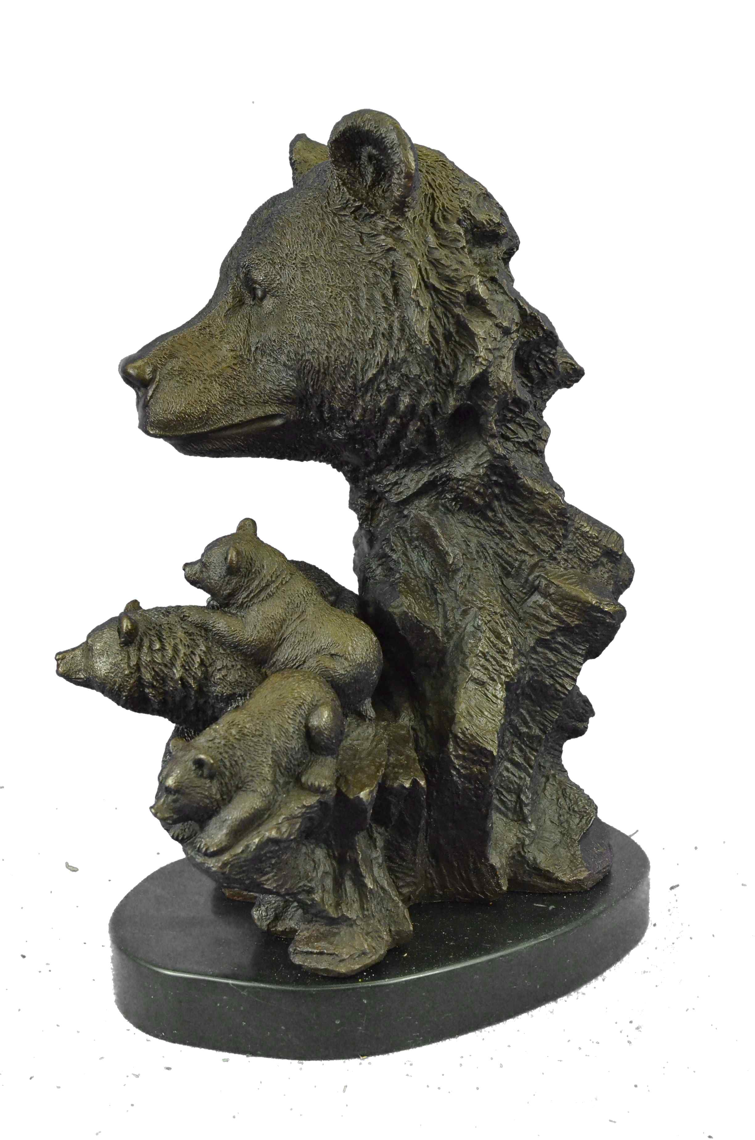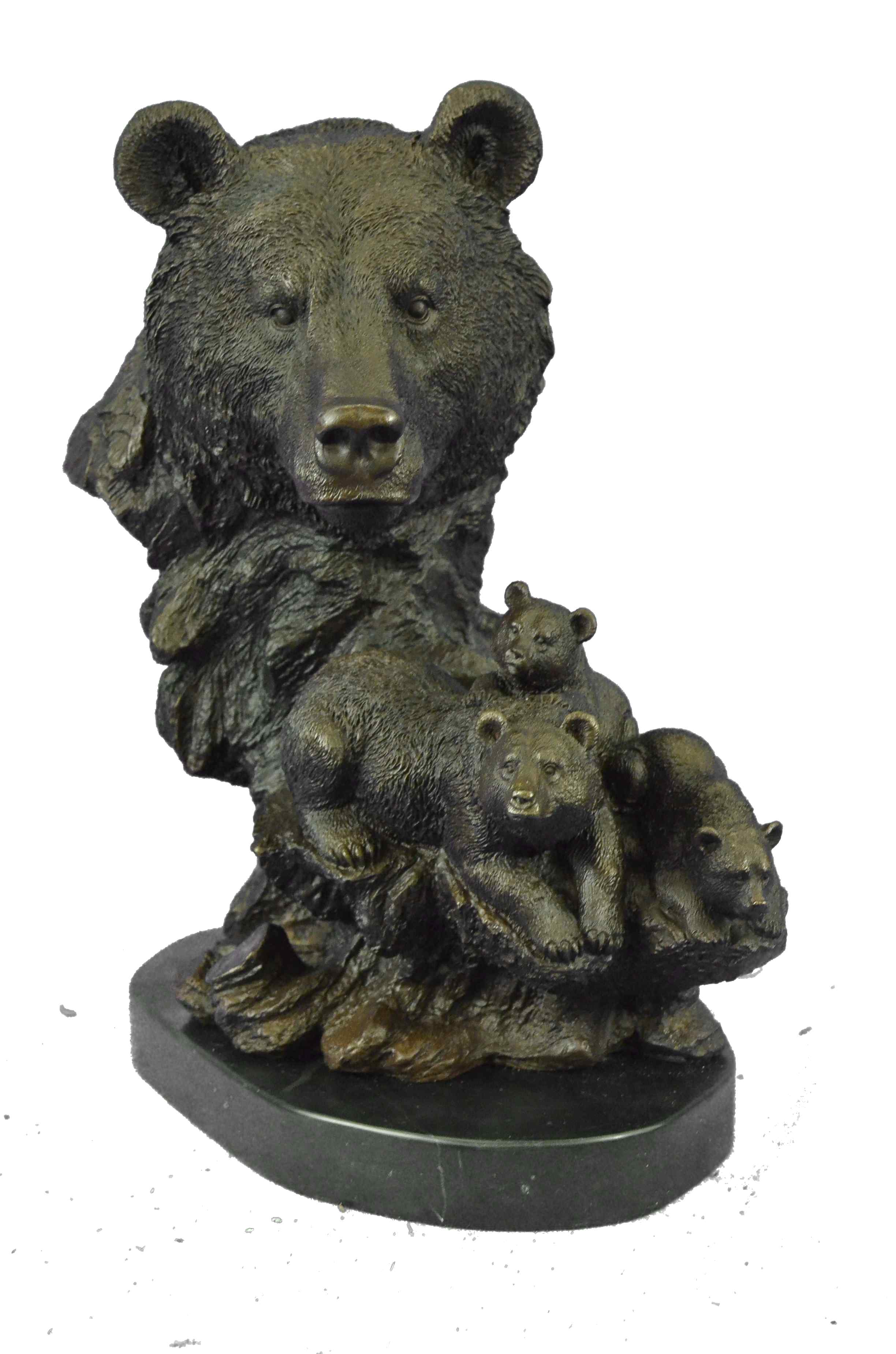 The mother and cubs can be imagined walking in folly along the bank of a roaring river. They all look out at the viewer with a enigmatic almost calm manner as one of the cubs jumps on the mother`s back hoping to play. In the Native American spiritualistic beliefs the bear totem signifies primal power, motherhood, cunning, healing, gentle strength, dreaming, sovereignty, intuition married with instinct, nurture and protection. The handmade bronze sculpture was cast using the age-old method of lost-wax casting and stained with a brown patina finish for preservation. It is mounted upon a black marble base with the European Bronze Finery stamp of quality with the artist Signature Fisher.Original or Reproduction: Original