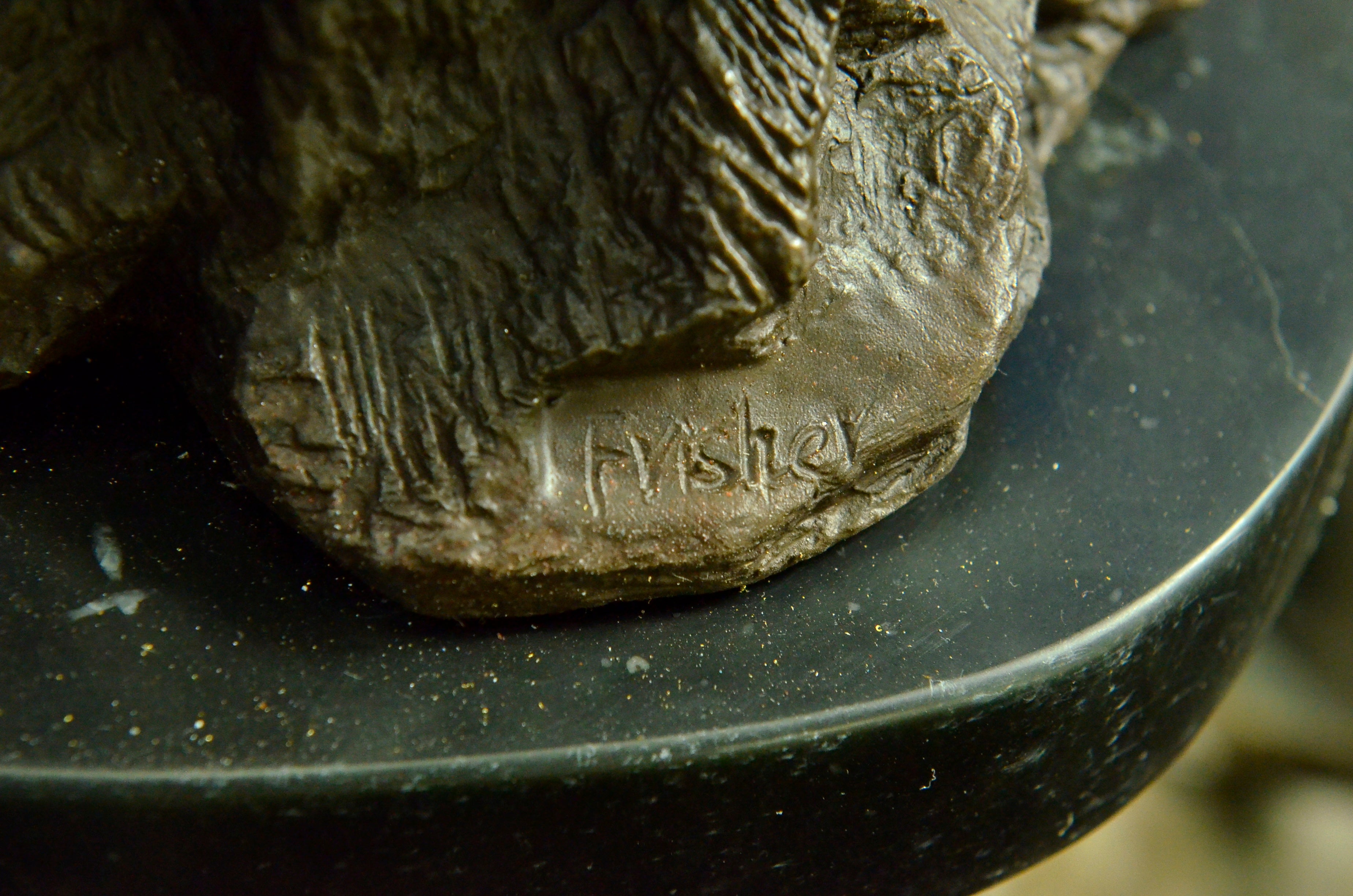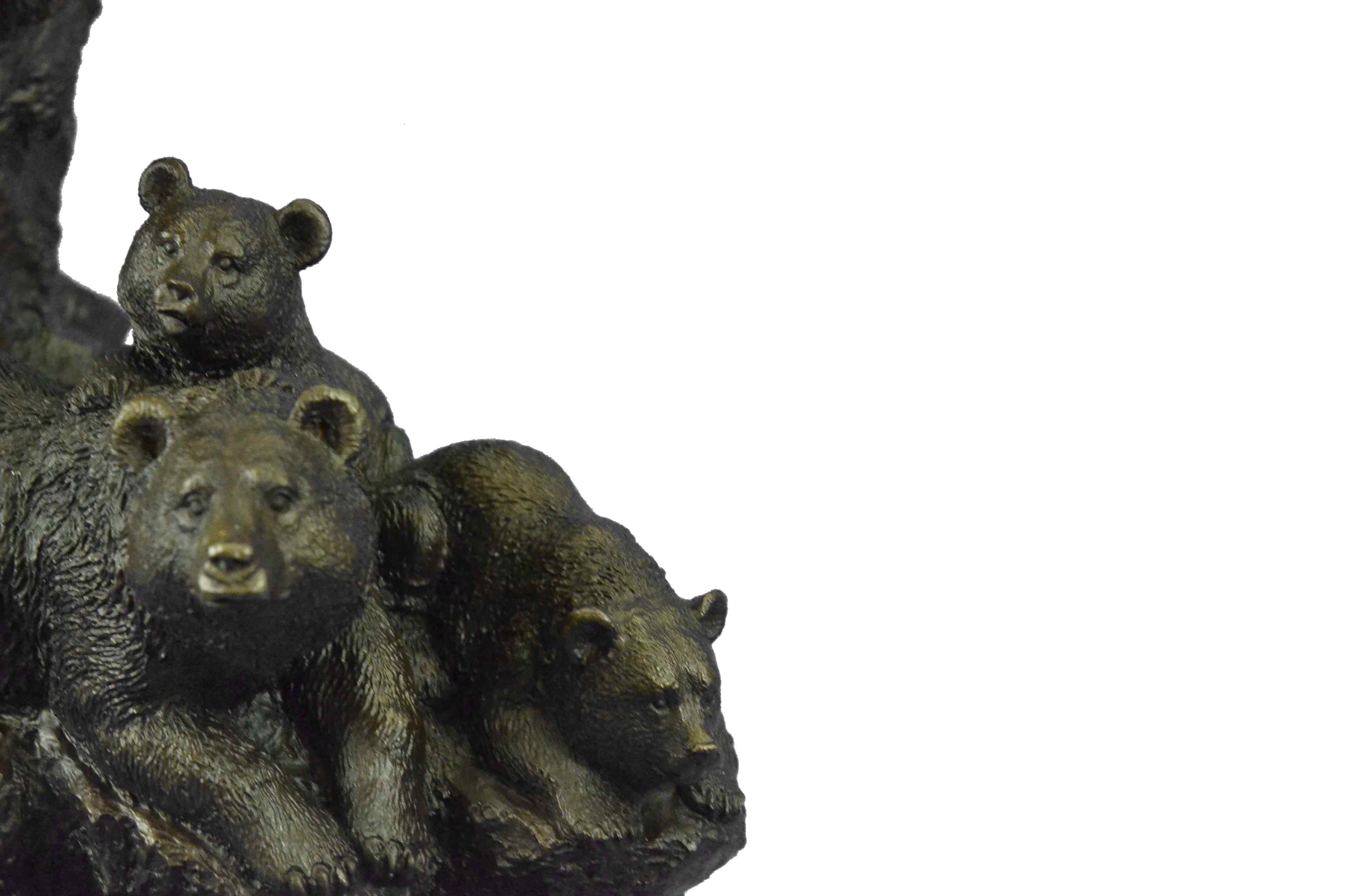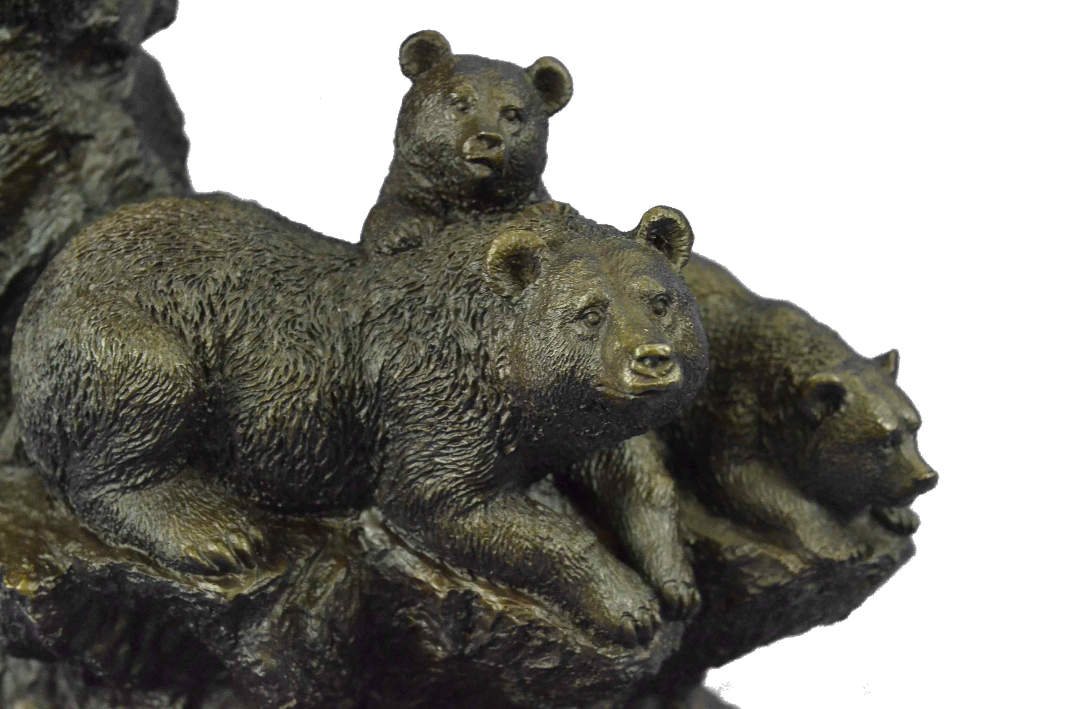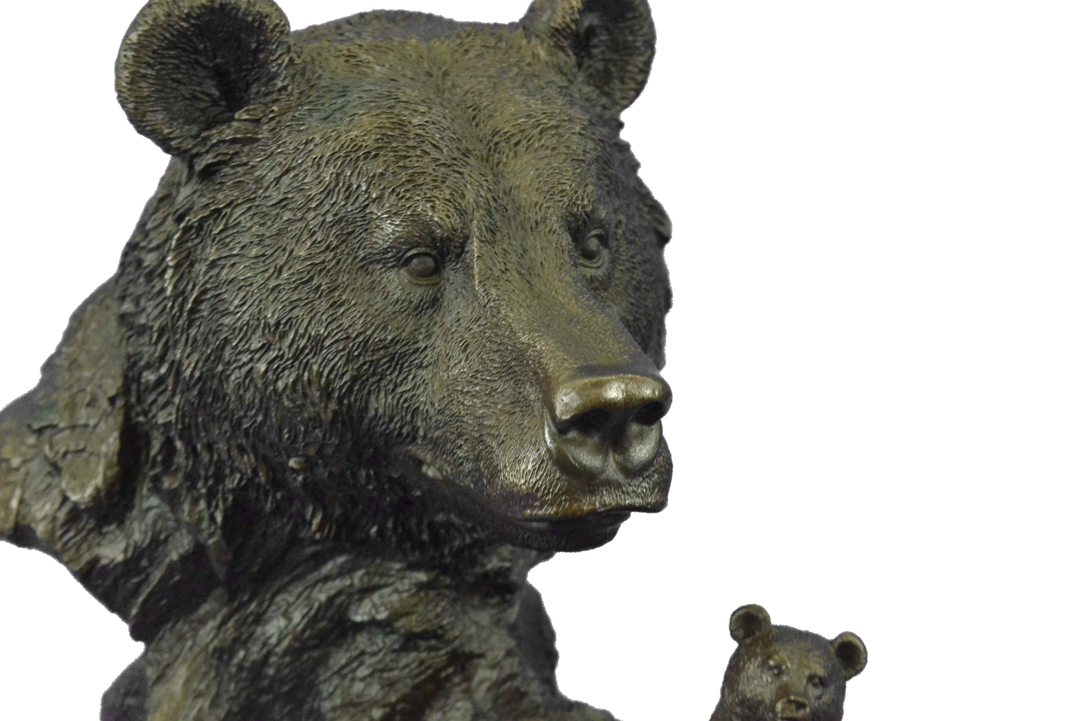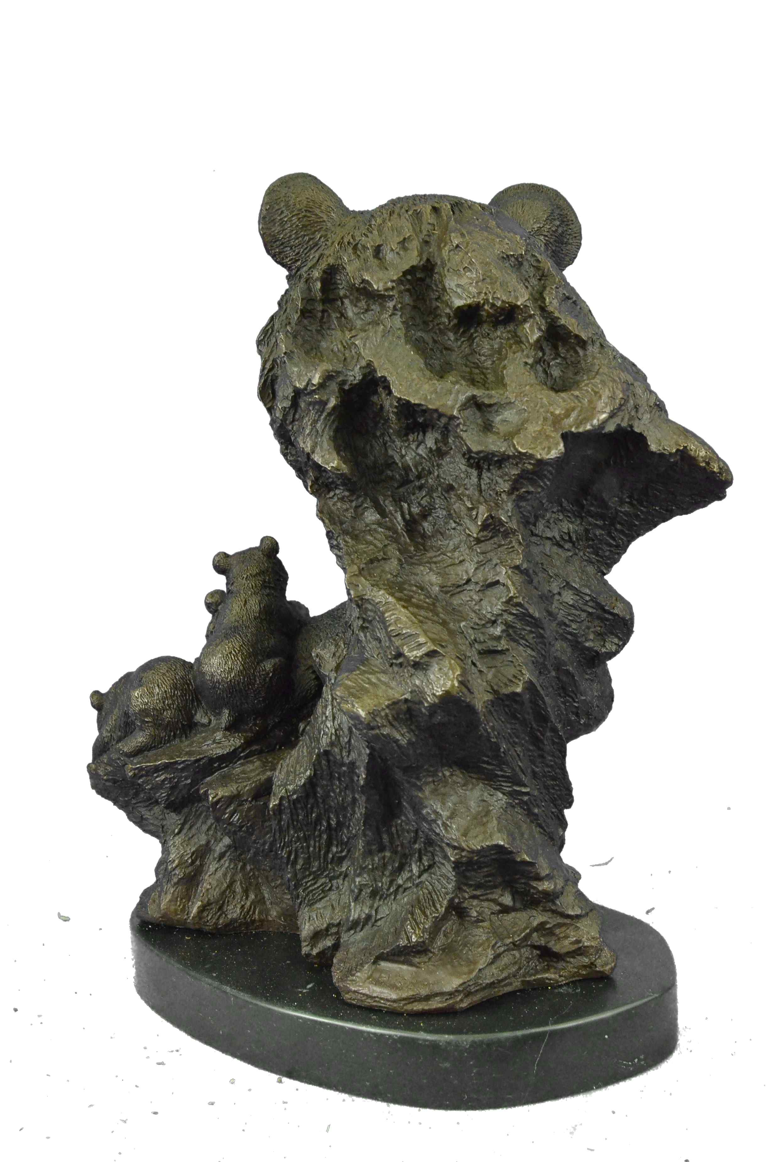 The mother and cubs can be imagined walking in folly along the bank of a roaring river. They all look out at the viewer with a enigmatic almost calm manner as one of the cubs jumps on the mother`s back hoping to play. In the Native American spiritualistic beliefs the bear totem signifies primal power, motherhood, cunning, healing, gentle strength, dreaming, sovereignty, intuition married with instinct, nurture and protection. The handmade bronze sculpture was cast using the age-old method of lost-wax casting and stained with a brown patina finish for preservation. It is mounted upon a black marble base with the European Bronze Finery stamp of quality with the artist Signature Fisher.Original or Reproduction: Original
