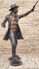 Perfect for history enthusiasts, collectors, or anyone who appreciates fine art, this "Wyatt Earp Shooting" sculpture is a timeless and evocative addition to any collection. Its detailed craftsmanship and powerful portrayal make it a standout piece that will inspire admiration and conversation, celebrating the heroism and spirit of one of the Old West's most iconic figures.Bronze Dimensions with Marble Base: Height 32" X Width 21"