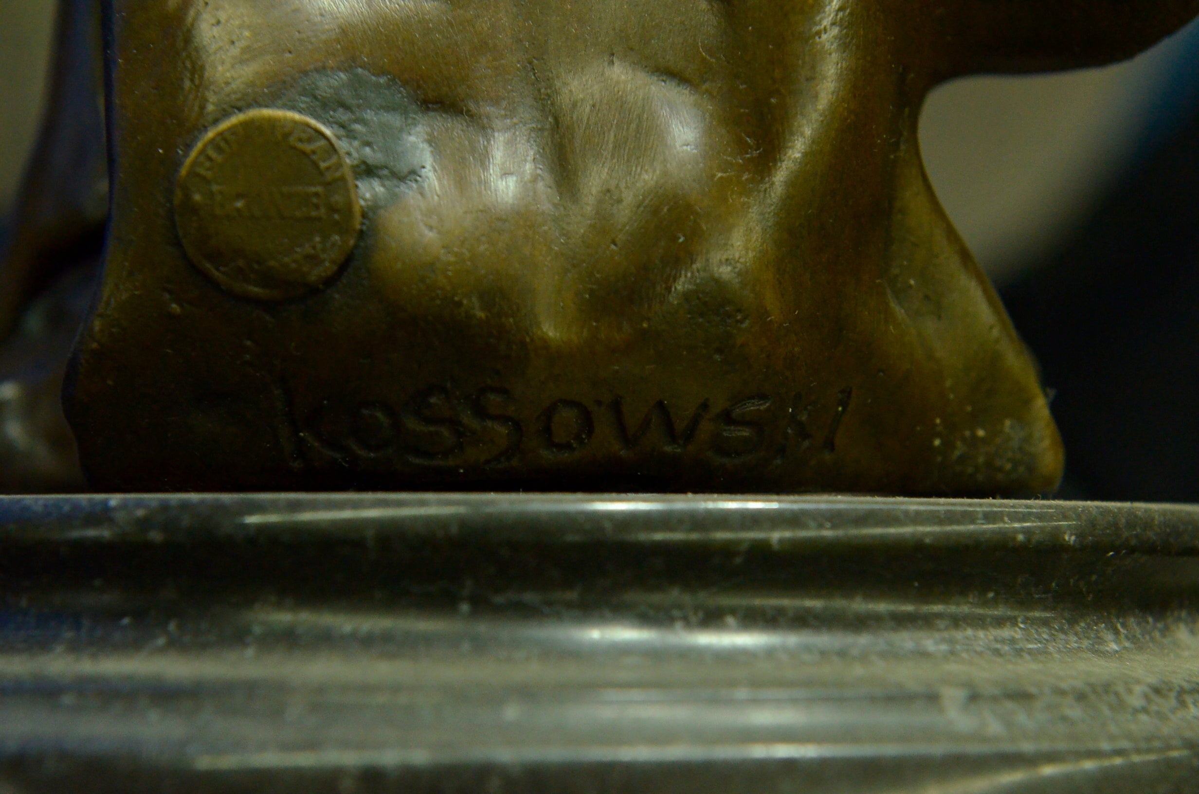 A young woman plays a soothing song on her flute. She puckers her lips around the slender instrument and blows. She shuts her eyes and listens to her melody, confident that she will not hit any sour notes. Her musical notes lift into the air that swirls around her. Her golden yellow patina goddess dress hangs loosely over her slender body. She entertains all who steal a moment to listen to her sweet lullaby. 100% bronze and handmade, this brown patina sculpture was cast using the “Lost Wax Method” and is mounted on a round marble base and is signed Kossowski.Bronze Dimensions with Marble Base:Height 19" x Width 6"