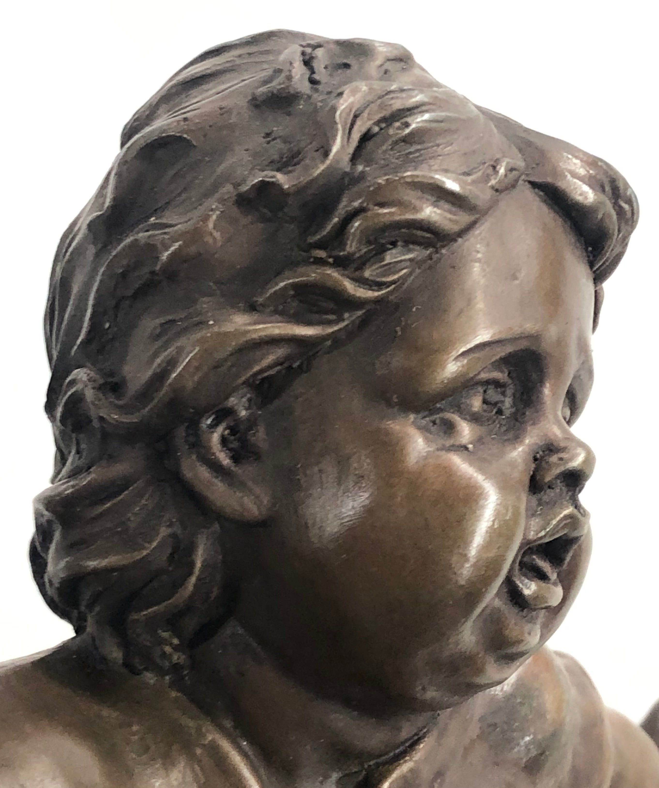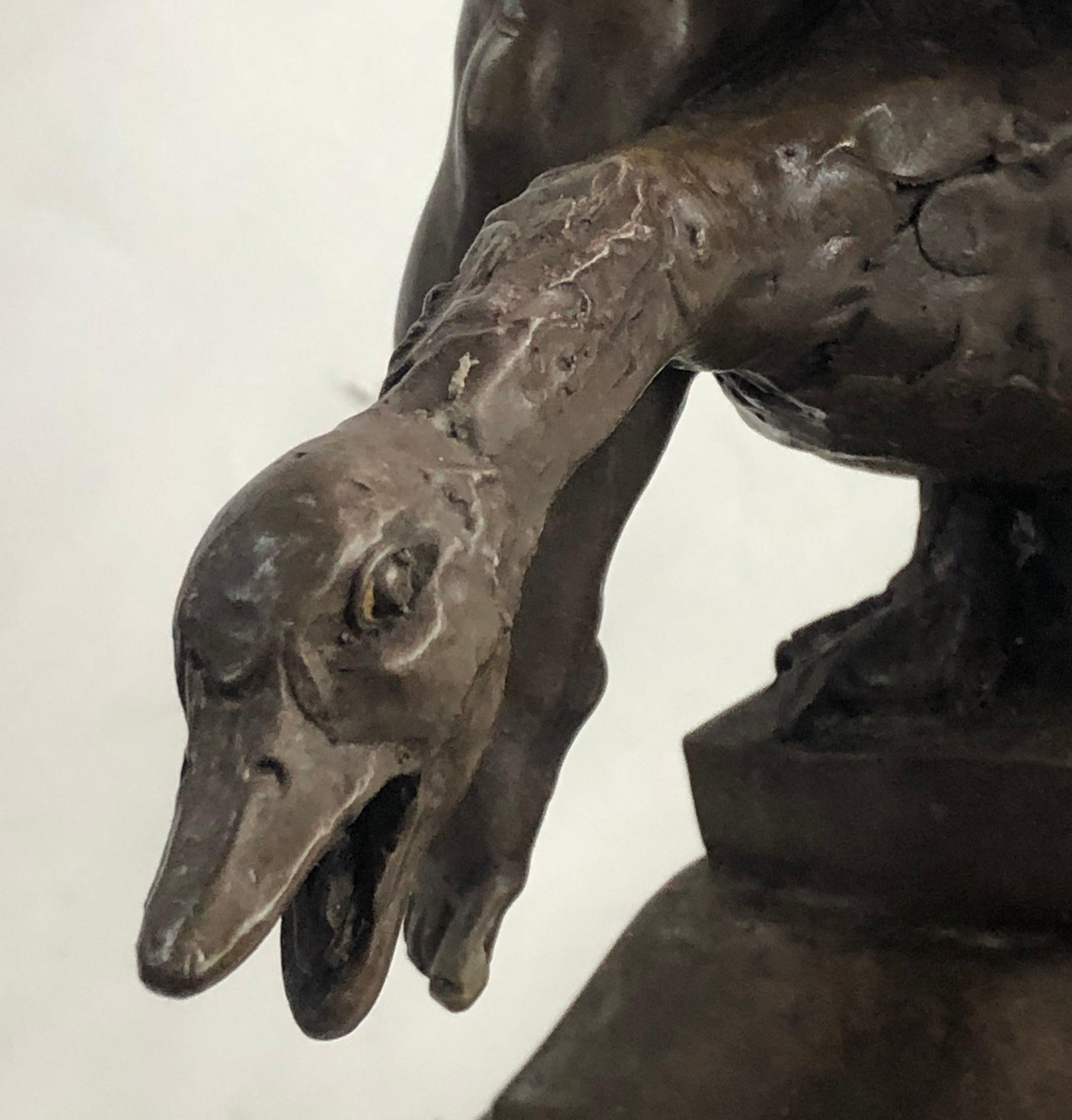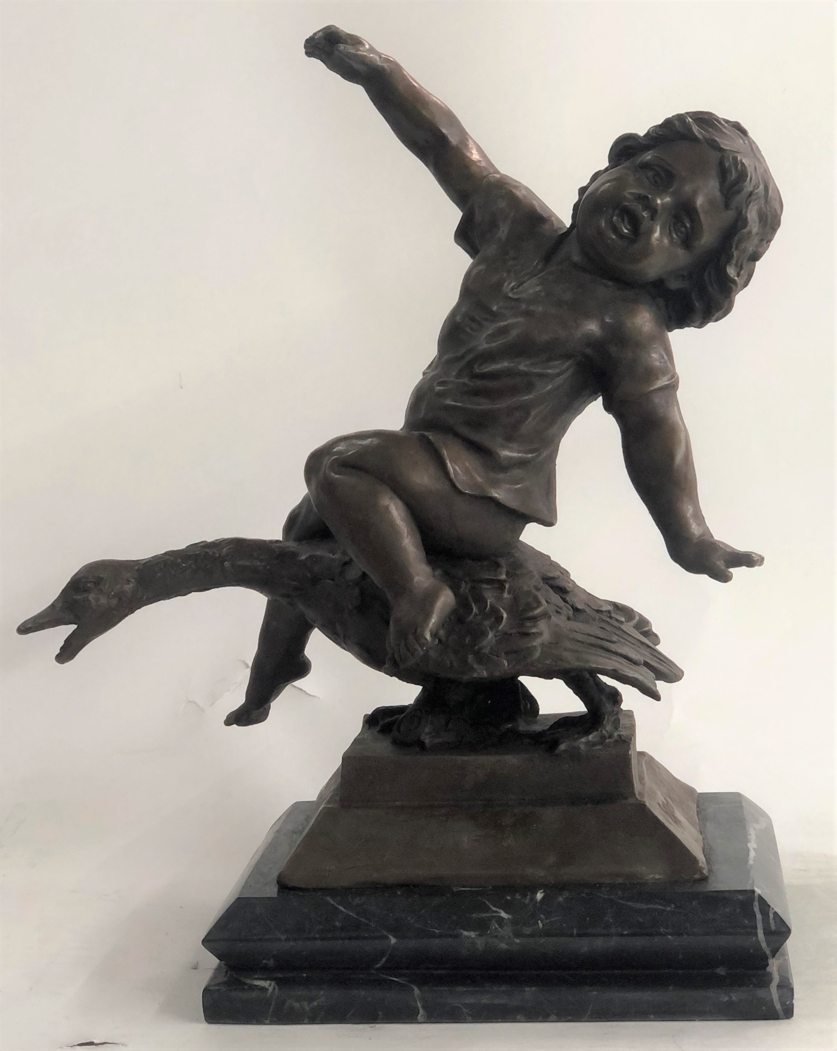 Up for your consideration is this great Sculpture of a "Young Girl riding a Goose". She is bare foot with a great smile on her face , which appears to be coming at her. Her expression would indicate she is very happy. The details of the sculpture are beautifully articulated. The swing & flare of the bottom of her shirt, The buttons up the back of her sleeveless jumper, the attitude of the goose. This is a wonderful detailed sculpture, it has a wonderful Patina. The Girl & the Goose is mounted on a marble base and is signed Dinee.Bronze Dimensions with Marble Base:Height 14" x Width 10"