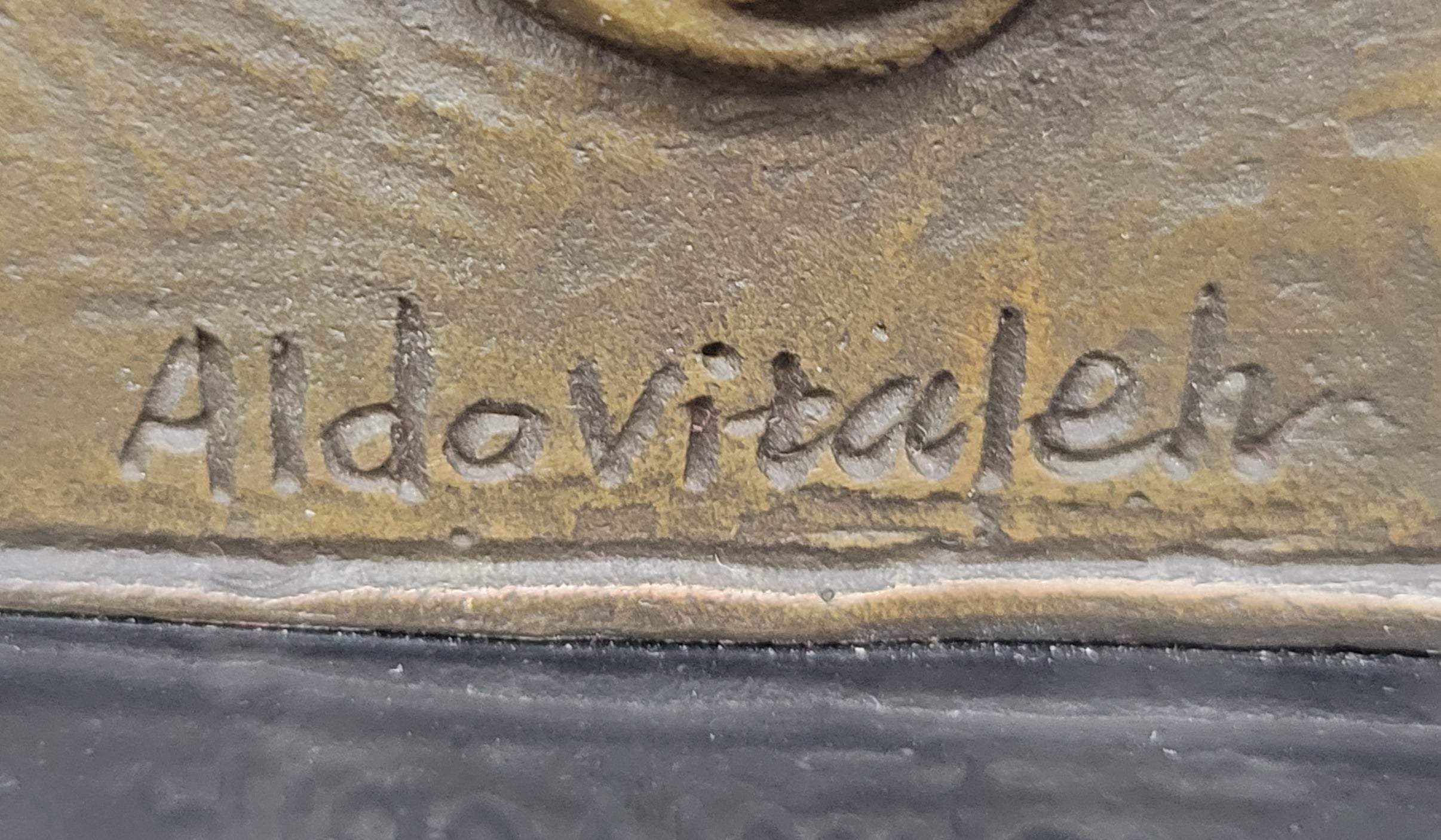 Whether displayed in a home, office, or art collection, this original Aldo Vitaleh bronze statue is sure to captivate admirers with its emotive portrayal of a man lost in contemplation. Its timeless beauty and masterful craftsmanship make it a treasured piece that will spark conversation and intrigue for generations to come.Bronze Dimensions with Marble Base:9.5" X 9.5"