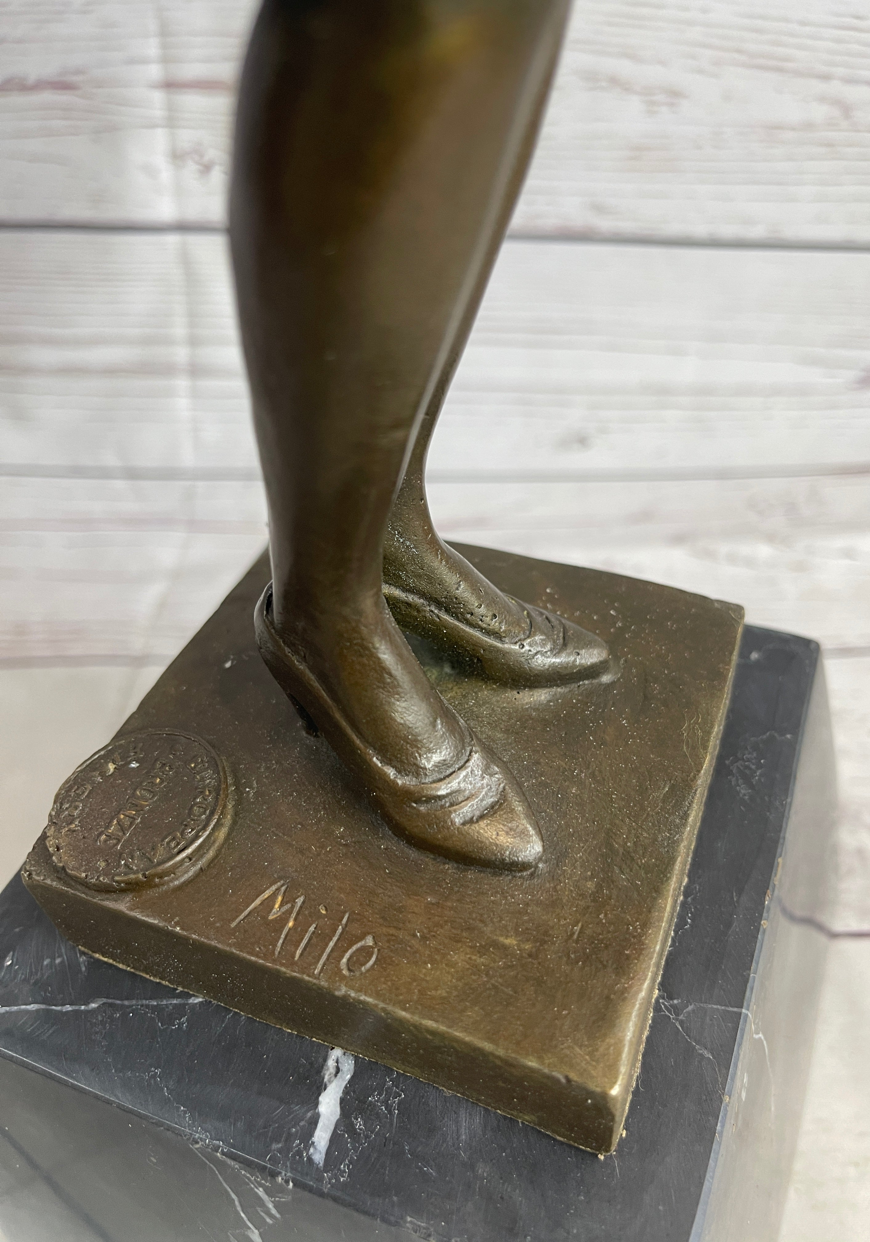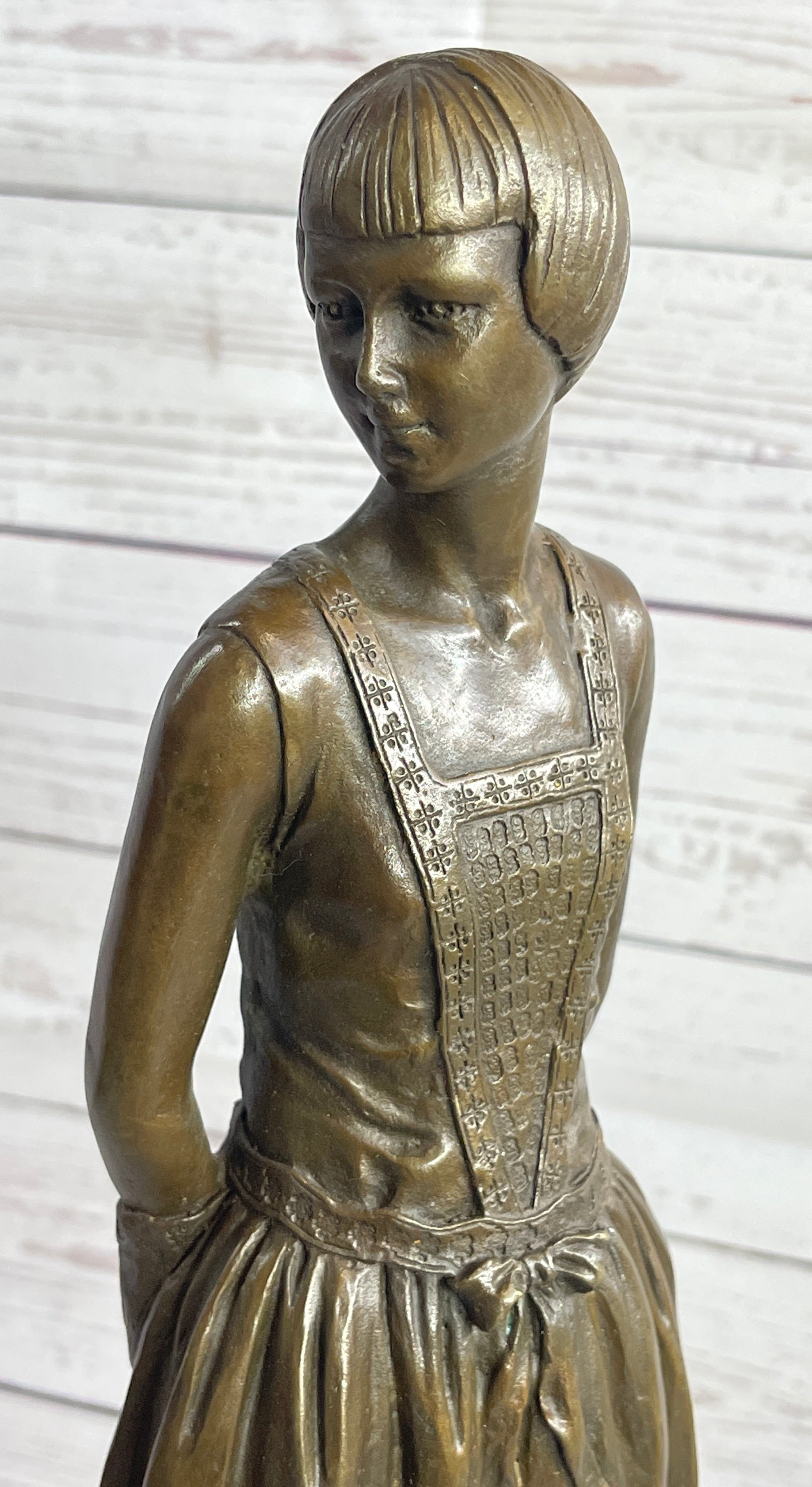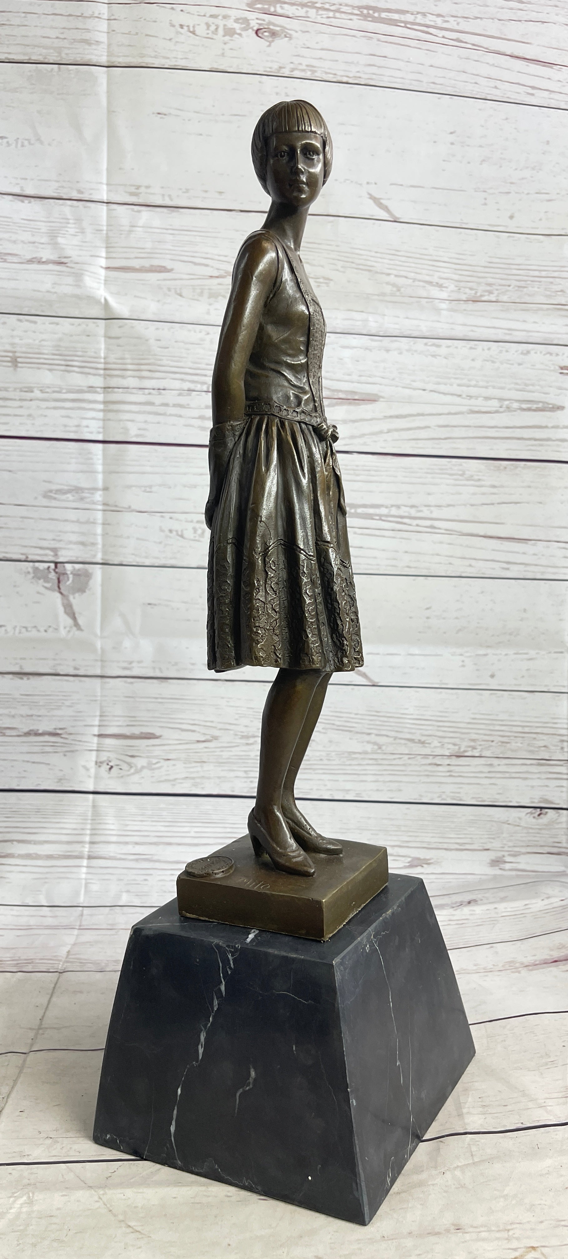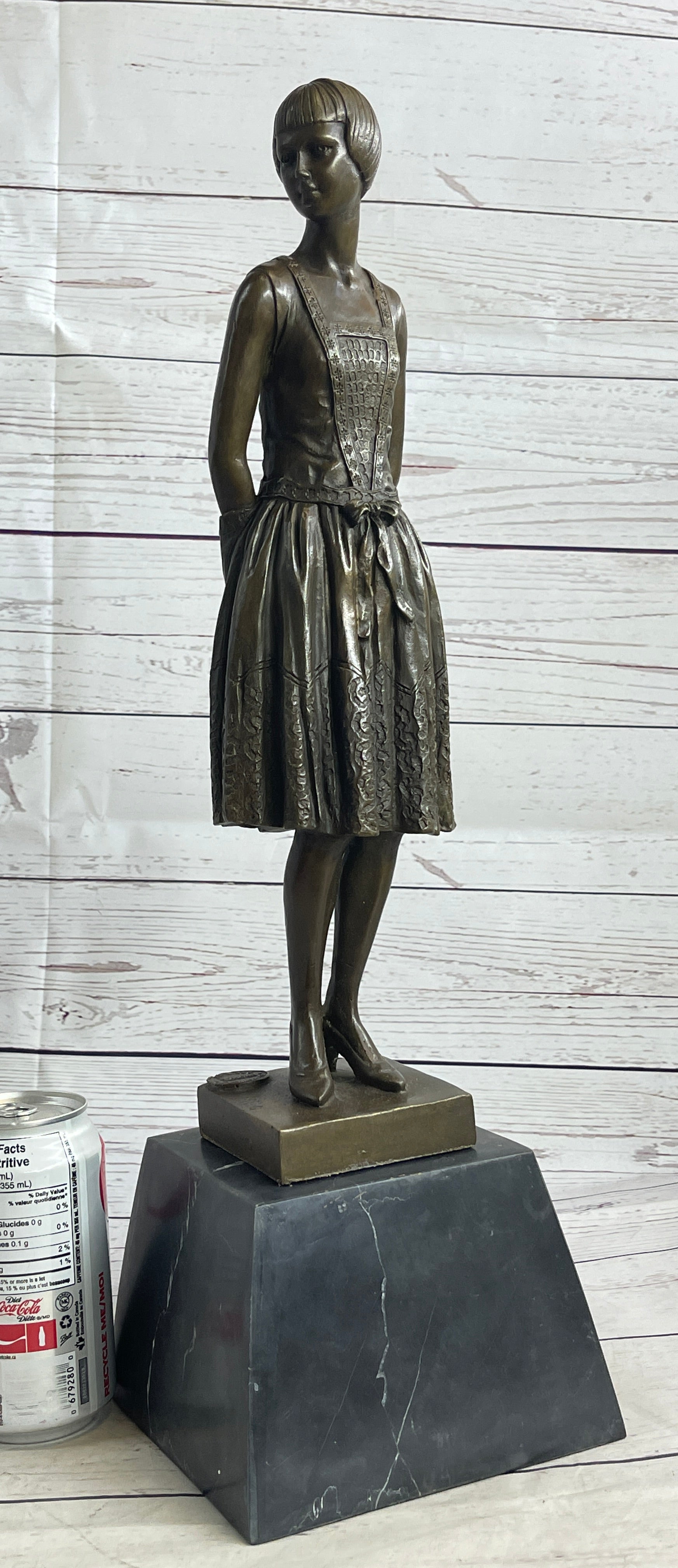 Young Woman in Dress With Short Hair Bronze Figure Statue Sculpture on Marble Base